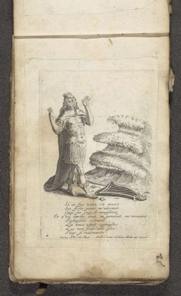 Curator: Here we have "David en twee hellemonsters" by Michel van Lochom, created sometime between 1625 and 1647. It's a drawing made with ink on paper, employing engraving techniques. The artwork shows David with two hellish monsters. What strikes you first? Editor: The starkness. It’s essentially black ink on aged paper. The rawness of the engraving gives it a very immediate feel, a direct link to the artist’s hand. There's something almost brutal about the sharp lines used to render flesh and the infernal creatures. Curator: Indeed. The figure of David presents a complex character within the sociopolitical context of the time. While David's traditionally seen as a righteous figure, here, standing alongside these monsters, what could this positioning convey? What narratives are subverted or reinforced by that arrangement? Editor: Well, I’m drawn to the material contrast again. Look at the king’s adornments—the cloak, the armored skirt—all created through precise, deliberate work, while the paper, with its discolorations, feels almost accidental. The deliberate artifice is placed in such tension with the process and means that it really speaks to an uneasy combination of intent and creation. Curator: Precisely. And let’s consider the period. The Baroque style often used such dramatic visual devices. The very act of portraying David, perhaps in conflict or compromise with hellish elements, serves to explore deeper religious, moral, or even political anxieties circulating within Dutch society at the time. It is worth wondering whether David's strength and resolve would make him able to face inner struggles of guilt or temptation as representative for that audience? Editor: Absolutely. And those "hellish monsters" clearly have a strong bestial aspect, rendered through tangible marks upon the page. Van Lochom transforms base materials into powerful symbols, inviting us to confront the uncomfortable realities of the society around them and reflect how virtue might exist so near to sin. Curator: Ultimately, the intersectional narratives—between good and evil, power and morality—forces the audience to assess historical attitudes in their modern contexts. Editor: Right. And on my part, I cannot separate my reading from an analysis on materials and their construction that brings the art making to center stage.