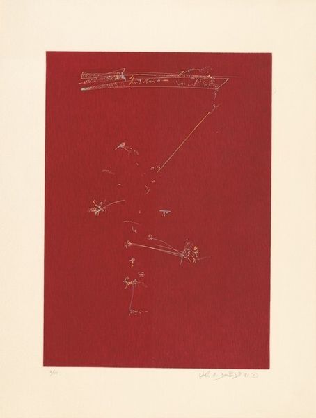Curator: This striking wood engraving titled "Crucifix" is by Eric Gill. Though undated, it resides in the Tate Collections, a testament to Gill’s unique style. Editor: Immediately, I'm struck by the starkness, its almost unsettling simplicity. The red against the cream feels very direct, emotionally. Curator: Gill was deeply engaged with religious themes and his art often explores spiritual concepts through a modernist lens. Note the geometric forms. Editor: Yes, the simplified anatomy and abstract halo almost defamiliarize the subject. It’s like a primal symbol of suffering, stripped down. Curator: The color reinforces that rawness, perhaps evoking blood or passion. The pose, though iconic, feels angular, almost confrontational. Editor: There's a tension here between tradition and abstraction. It forces a fresh look at a very old story, wouldn't you say? Curator: Absolutely. Gill challenges us to engage with the crucifixion beyond rote observation, making it a visceral, immediate experience. Editor: Ultimately, it's a powerful piece precisely because it avoids sentimentality. It's a symbol refined, raw, and unforgettable.