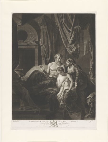 Editor: So here we have "Susanna and the Elders," a 1729 engraving by Louis Surugue. It depicts Susanna, and the leering Elders. I find it quite unsettling... like witnessing a secret, uncomfortable moment. What's your take? Curator: Unsettling is spot on! The composition itself creates that tension. Susanna is bathed in this almost theatrical light, but it also spotlights her vulnerability. Then you have these peeping Toms lurking in the shadows… their presence casts this…sticky discomfort that almost oozes out of the print. Surugue masterfully uses the crisp lines of the engraving to define every fold of fabric, every lecherous glint in their eyes, no? What do you think Surugue is trying to tell us? Is it about female virtue? Male power? Or something murkier? Editor: Maybe it's about the abuse of power, then and now? The vulnerability feels timeless. Curator: Precisely! And the clever layering – Susanna in the light, the elders shrouded – emphasizes that dynamic. The story's been revisited countless times in art history, but here, the almost clinical precision of the engraving adds to that sense of cold, calculated violation. Think about it; each tiny line contributes to a bigger picture of injustice and exploitation. Does the style, baroque, in any way contrast with its brutal themes? Editor: It's like wrapping something horrible in beauty, which in a way only serves to amplify the horror. Curator: Exactly. Makes you think, doesn't it? Editor: It does. It makes you think a lot. Curator: Surugue makes our discomfort profound, making us reckon with it in unexpected ways. A mirror of moral complexity in shades of gray!