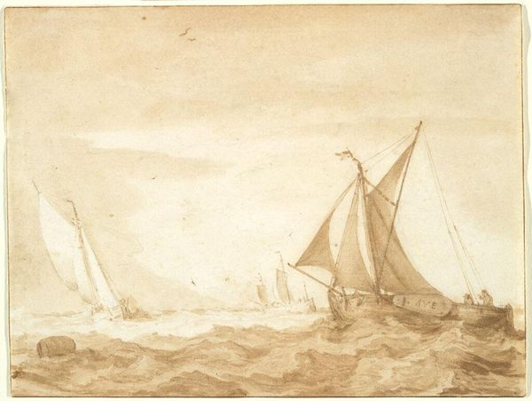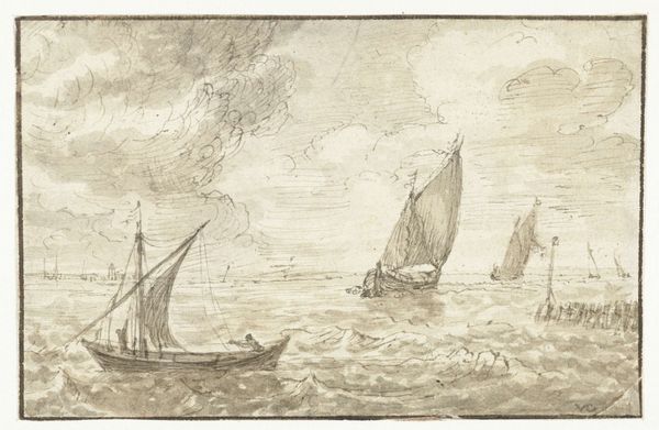 Here we see "Schepen op woelig water", or "Ships on stormy waters," by Cornelis de Griendt, rendered in ink and grey wash. The eye is immediately drawn to the dynamic interplay of horizontal and vertical lines that dominate the composition. The undulating waves in the foreground establish a base rhythm which is then countered by the masts and sails of the ships. De Griendt masterfully balances the chaos of the sea with structural order, presenting a compelling tension. Semiotically, the ships serve as signs of human endeavor set against the sublime, almost overwhelming power of nature. Note how the artist uses the monochromatic palette to emphasize texture and form. The varying shades of grey create depth, suggesting a vast and potentially disorienting space. This aesthetic choice underscores a broader philosophical engagement with human existence as an exercise in navigating the unpredictable forces of the world. The formal elements in "Schepen op woelig water" therefore do more than please the eye; they offer a meditation on humanity’s place within an unbounded, often turbulent, universe.