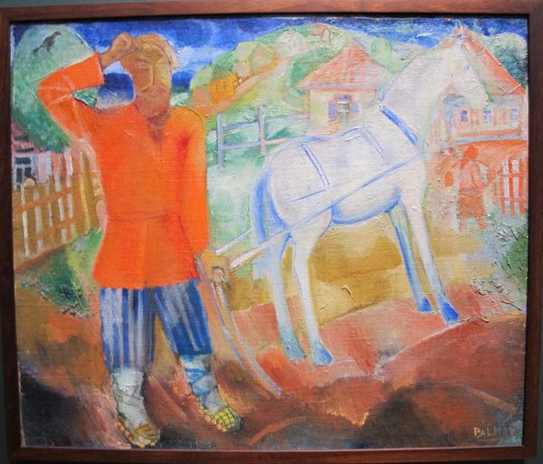 Editor: Here we have Roger de La Fresnaye’s "The Shepherdess. Spring Marie Child," painted in 1910. It's currently held at the Musée d'Art Moderne de Troyes. What strikes me is the almost dreamlike quality – the colours are vibrant, but the figures have a kind of simplified, geometric feel. How do you interpret this work? Curator: The seeming naivety is deceptive. Consider the historical context: early 20th century France, a society grappling with industrialization and urbanization. Artists were searching for authenticity, a return to simpler times. La Fresnaye, while later involved with more avant-garde movements like Cubism, here draws on romanticized depictions of rural life that were pervasive in the arts and literature. Notice how the shepherdess, seemingly self-sufficient, is the focus, yet her face remains obscured, almost archetypal. What does that say about the painting’s message, do you think? Editor: Perhaps it’s less about the individual and more about the idealized representation of labor, a return to nature that feels detached from the harsh realities faced by many at the time? Curator: Precisely. It highlights the social commentary often subtly embedded in genre paintings. By showcasing an idealized pastoral scene, La Fresnaye engages with prevailing anxieties surrounding modernity. Think about how the museum itself, as an institution, further elevates and perhaps even sanitizes this portrayal. What stories do we choose to tell through art, and whose narratives are privileged? Editor: That makes me reconsider my initial interpretation. It’s much more complex than I initially thought. Curator: Absolutely. And that’s the beauty of art history, isn’t it? It prompts us to critically examine the intersection of art, culture, and power. Editor: Definitely something to keep in mind moving forward. Thanks for pointing those details out.