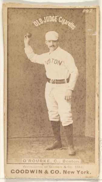 Goodwin & Company produced this Old Judge Cigarettes baseball card around 1887. The sepia tone flattens the subject, focusing our attention on the structure of the image itself. The player, Burdock, occupies the center of the frame, his body forming a strong diagonal axis, balanced by the curve of the "Old Judge Cigarettes" text at the top. This creates a dynamic tension, a semiotic dance between athleticism and commercialism. The composition uses a limited tonal range, which emphasizes the form and texture of the player's uniform, drawing attention to the clean lines and geometric shapes. The monochrome palette pushes us to engage with the underlying structure of the photograph. The player’s body is carefully arranged and seems to float against the card surface. This challenges conventional representation, inviting a close examination of how meaning is constructed through visual form. Ultimately, this card functions not just as a promotional item, but as a study in composition. It is a reminder that even the most everyday images can be analyzed for their formal elements and the ways in which they engage with broader cultural and philosophical questions about the act of seeing.