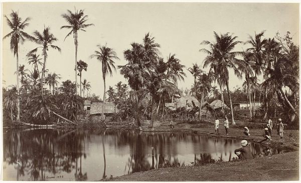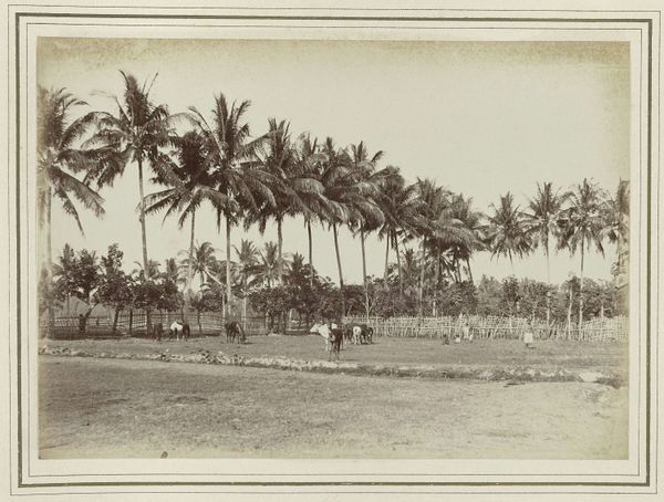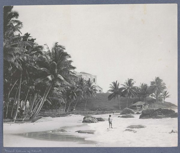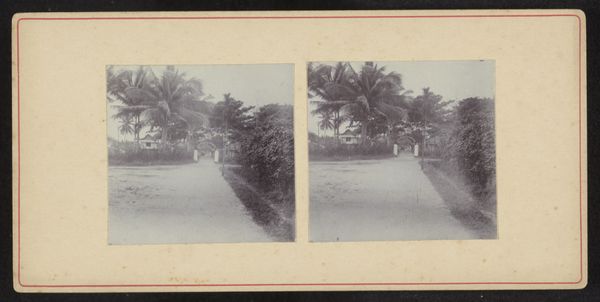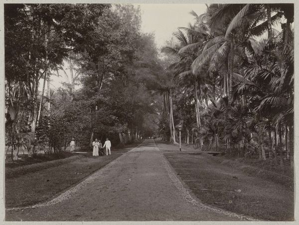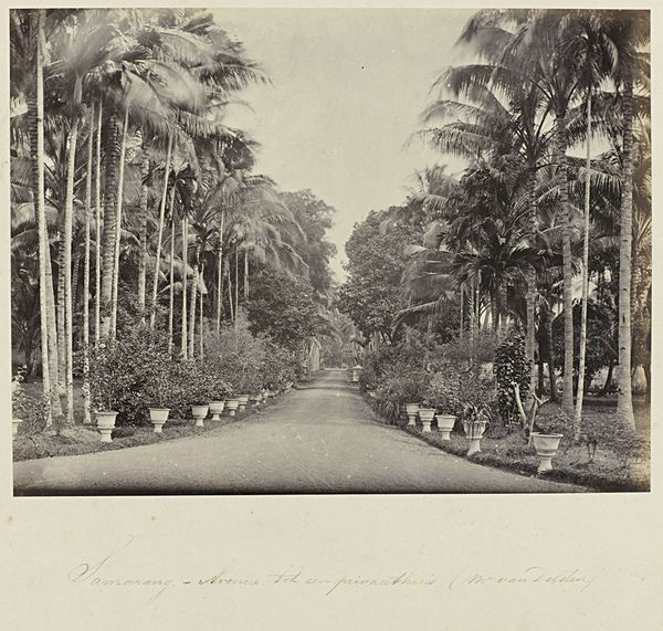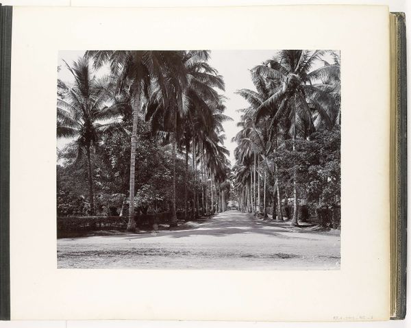 Curator: Looking at "Weg naar Garoet," a gelatin silver print attributed to Onnes Kurkdjian, taken sometime between 1890 and 1935, the initial feeling I have is one of immense peace. Editor: My eye is drawn to the contrast—the formal arrangement of the towering palm trees against the figure burdened with a load walking into the distance, creating a dialogue between labor and the picturesque. Curator: Indeed, the interplay is crucial. Consider how the artist frames the composition; the road acts as a strong diagonal, pulling the viewer’s gaze toward the distant mountains. The structural elements dictate a narrative of journey. Editor: Yes, and the materiality itself adds layers of meaning. A gelatin silver print implies a specific production process, reflecting the burgeoning accessibility of photography, almost as an industrial object to serve imperial eyes. How was the work distributed and consumed within the colonial context? The means of production can speak volumes. Curator: Certainly. Yet, within its context, one cannot overlook how it presents a meticulously curated view of an exotic locale. Observe the gradations of light and shadow, used to produce depth and volume; its structural essence conveys meaning of place and, to some extent, power. Editor: But this curated view is inextricable from the labor present, isn’t it? The photograph aestheticizes the journey but in doing so may be concealing exploitation. The weight that the lone figure carries – we are made to appreciate the journey, not to scrutinize who serves or makes such a passage convenient. The print then exists at the crossroads of documentation, tourism, and social commentary. Curator: A compelling reading! This close look allows us to explore a piece rich in contrast not only visually but conceptually as well. Editor: Precisely! By grappling with both its aesthetic framework and the realities of its production, a deeper comprehension is reached.