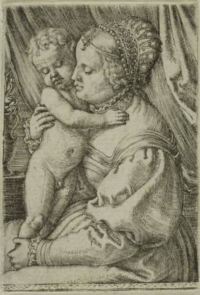 Curator: Looking at this artwork, I immediately think of vulnerability. There's something so exposed about the way the figures are presented. Editor: Well, let's contextualize that vulnerability. Here we have Martin Schongauer's "The Madonna on the Crescent Crowned by Two Angels," created sometime between 1470 and 1475. This print, currently housed here at the Art Institute of Chicago, provides a really fascinating view into the social and religious climate of late 15th century Germany. Curator: Exactly! Consider the historical implications. The female body is a battleground for both spiritual devotion and social control. I'm struck by the softness of the Madonna's face in contrast with what feels like a steely gaze. Editor: I find the technical skill of this engraving compelling, given the time period. The details Schongauer achieves in the drapery, the angel's wings, and even the infant Christ's curls using only line work, speaks volumes about printmaking at the time and its rapid development. The symbolic representation of the Virgin Mary as Queen of Heaven—standing on a crescent moon—is a standard, but its handling here seems unique. Curator: Absolutely. And look at the positioning. The gaze is central to this Madonna, both her’s and our own, confronting centuries of expectations placed upon the maternal figure within both a spiritual and terrestrial setting. Is the work truly celebrating her power or trapping her further within the gilded cage? Editor: The availability of prints to a broader public starts to allow those expectations and narratives of power to disseminate in new ways—something that changes our visual culture dramatically over time. Schongauer's accessible art plays a part in democratizing religious iconography. Curator: It underscores art's enduring power, doesn’t it? To mirror, critique, and shape our understanding of the roles and representations assigned throughout society and across centuries. Editor: Precisely. It showcases the transformative role that visual representation holds in both mirroring and shifting the foundations of collective ideologies. It definitely gives you a lot to consider.