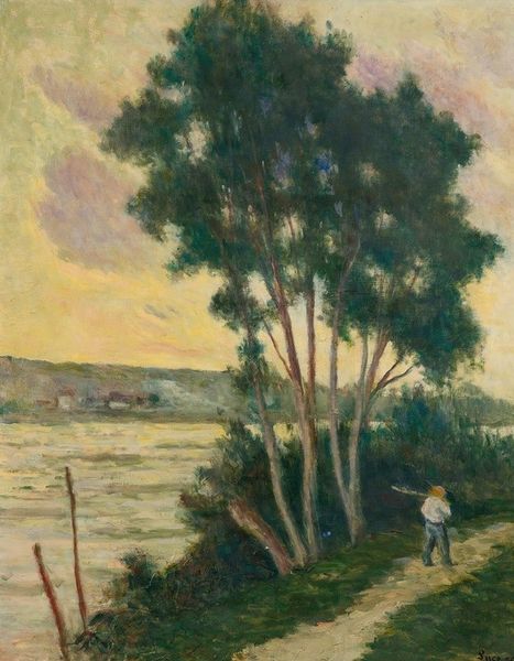 Curator: Ah, "Path Along the River's Edge" by Ernest Lawson, painted around 1910. It resides here at Crystal Bridges. What catches your eye first? Editor: Immediately, the materiality! The heavy impasto. Look at how the paint is built up, layer upon layer, especially in those trees. It’s tactile, almost like the landscape itself is pushing outwards. Curator: It's true; Lawson was renowned for that technique. It’s pure, ecstatic sensory overload. I think I can almost feel the gentle breezes... he has perfectly encapsulated the transient effect of light filtered through those hazy skies. Editor: Transient indeed! And the figures. Almost an afterthought, yet vital for gauging scale. That's some serious pastoral labor taking place. The horse's toil mirrors Lawson's own physical labor with those thick strokes, pushing pigment across the canvas. Did he do sketches beforehand, or just dive in, applying directly the pigment on location? Curator: More like "plein air poetry", if you ask me. There’s something deeply Romantic, an unashamed affection for nature here. It's that silvery light, playing across the river. I find the Romanticism very satisfying; so earnest. But beyond aesthetics, the labor invested also moves me. Editor: Yes, it's clear that these canvases are produced within an industrial setting with complex interactions of resource and energy. Let's acknowledge how industrial advancements played their part. These scenes become a testament to labor power and landscape degradation as resource, not just reflections on some pastoral escape. Curator: Maybe, but even with a dose of urban grit implied, his touch elevates the ordinary into something ethereally beautiful! Don’t you find it charming? Editor: Charming perhaps masks that this scene reflects the negotiation between man, animal and landscape shaped by power relations intrinsic to the socio-economic context Lawson was enmeshed in... a point to reflect on. Curator: Well, charming *and* thought-provoking, shall we say? Editor: An important duality worth remembering, perhaps!