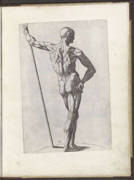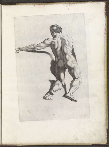 Editor: Here we have Giovanni Luigi Valesio's "Statue of the Naked Julius Caesar," an ink drawing on paper created sometime between 1636 and 1647. The rendering of the figure feels both powerful and somewhat unsettling. How would you interpret Valesio's choices here? Curator: A close examination of the work reveals several points of interest. First, consider the line work itself. Note the precise, controlled hatching and cross-hatching, building volume and shadow across Caesar’s physique. The academic style emphasizes anatomical accuracy, striving for a kind of idealized naturalism, yet something feels amiss, wouldn't you agree? Editor: I do. Maybe it's the… stiffness? He seems caught between stances. Curator: Precisely. The composition divides into distinct zones: the meticulously rendered figure against the less defined background, the sharp focus on Caesar’s musculature drawing our immediate attention, juxtaposed with the roughened textures of the drapery and base. Ask yourself, how does this affect our reading of the work? Does it create tension, or harmony? Editor: Tension, I think. The stark contrast makes the idealized body feel almost… artificial, even for an artistic rendering of a historical statue. Curator: Consider, too, the limited tonal range, constrained by the ink medium. It focuses attention on the graphic elements, the strength of line and form over color or atmospheric depth. This simplification forces us to contemplate the abstract qualities of the figure – its shape, its posture, its presence. Editor: So, by analyzing the artist's technique and choices of form, we can discover deeper meaning in what might otherwise appear as just a straightforward portrait? Curator: Exactly. Formal analysis provides the tools to decode the visual language, allowing us to arrive at our own understanding of Valesio's artistic choices. Editor: That's fascinating. Thank you for that insightful explanation!