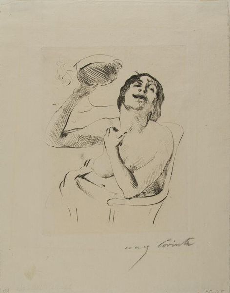 Suzanne Valadon made this etching, Woman at Her Bath, with ink on paper. The process here is key, she’s really pared things back, distilling the scene. It's a study in pure, confident lines, isn’t it? No fuss, just the essence of form, the way the bodies are outlined. The simplicity of it all is what grabs me. The etching feels almost like a drawing. And then there's that soft, grey background, it's like a whisper, a ghostly presence. It’s as if Valadon is pulling back the curtain on a private, yet universal, ritual. And look at the way she handles the drapery. Those swirling, almost playful lines contrast so beautifully with the stillness of the figures. Valadon reminds me a bit of Paula Modersohn-Becker, both fearlessly depicting the female form with such honesty and strength, and both being key players in a conversation which embraces ambiguity.