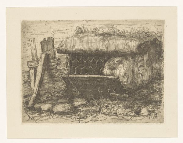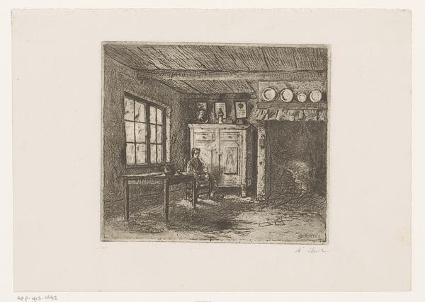 Editor: This is Camille Venneman’s "Interieur met vrouw bij wieg," or "Interior with Woman by a Cradle," from around 1857. It’s an etching. I’m struck by how simple the setting is, but it also feels so complete. What jumps out to you when you look at it? Curator: Immediately, I see the process of printmaking heavily influencing the image. The artist's hand is extremely visible in the etched lines; they build the entire space and narrative, really. Consider the social context – printmaking allowed for the relatively inexpensive reproduction of images, bringing art to a wider audience and, likely, depicting more scenes of everyday life rather than purely noble or historical subjects. Editor: So you're saying the *making* of the artwork changed who it was *for*, and what it showed? Curator: Precisely. The accessibility changed everything. Note the attention paid to the interior details – the wooden beams, the humble furniture. This emphasis signals a shift in what was deemed worthy of artistic representation, moving towards the quotidian experiences of a broader population who were now able to purchase and consume art. What materials did the artist have access to, and what were their societal implications? How were these prints consumed and circulated? Editor: I see what you mean! Focusing on those elements – the "how" and "why" – really makes the piece feel more relevant to the lives of ordinary people. Did this process of material production impact themes and narrative? Curator: Undoubtedly. It also blurred the lines between "high art" and "craft" in ways that were challenging to established hierarchies. Considering labor is important. Ask yourself: what kind of labor made the art and what kind does the image show? Editor: It's fascinating to consider the social implications baked into the etching process itself! I’ll definitely think more about production when I'm looking at art now. Curator: And I'll keep in mind the way art and subject matter intertwine, it seems critical to continue challenging tradition in terms of what should be worthy of depiction.