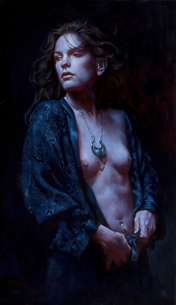 Adrian Gottlieb painted ‘Nimbus’ using oil. The canvas is dominated by a figure emerging from the shadows. Her form is built up through subtle modulations of tone and color, creating a soft, diffused effect reminiscent of classical chiaroscuro. The composition is structured around the interplay of light and shadow. Note how the subject's skin glows against the dark backdrop, drawing our eye to the delicate balance between concealment and revelation. This is not simply a study of light, but an exploration of the threshold between visibility and invisibility. The texture of the paint itself is crucial. Gottileb employs a smooth, almost imperceptible brushstroke to convey the smoothness of skin and the softness of the surrounding fabric. The painting invites us to contemplate the nature of representation itself, blurring the lines between the material world and the realm of the ideal.