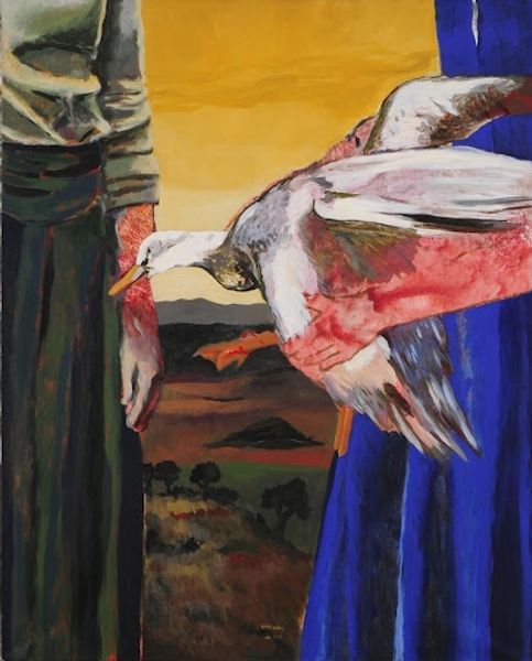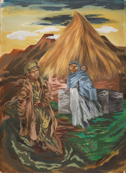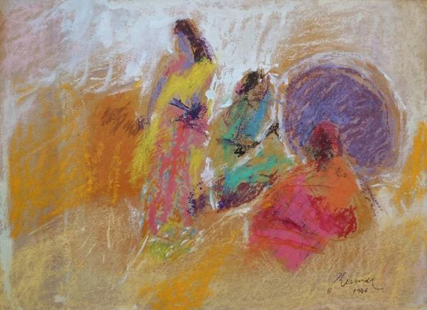 Editor: This is "We Saw Him" by Maria Bozoky, painted in 1996, using acrylic on canvas and watercolor. It definitely has a raw, emotional feel... kind of dreamlike and unsettling. The figures are almost melting into each other. What do you see in this piece? Curator: Melting, you say? That's a delicious way to put it. I'm instantly drawn into the intimate huddle of those central figures – locked in some whispered exchange or a shared vision, maybe. But it's the isolated figure, bathed in a feverish red on the periphery, that really grabs me. Is it a warning, a memory, or a Greek chorus commenting on the central drama? Editor: I hadn't really noticed that background figure so much. A Greek chorus, huh? Do you think that was Bozoky’s intention, some kind of historical reference? Curator: Intention is a tricky word, isn't it? Maybe "inclination" is softer. Those quick, gestural brushstrokes and vibrant, almost clashing colors smack of Expressionism, where inner emotional realities are splashed onto the canvas. Whether she consciously thought "Chorus!" I doubt it, but that feeling of bearing witness, of dramatic tension, is definitely there for me. What's your feeling on the narrative – the 'story', such as it is? Editor: Hmmm... narrative. I see figures, maybe a moment of revelation or disbelief given the title. The background figure seems separated, maybe emphasizing a division in belief? It makes me wonder about her personal story at the time. Curator: Exactly. We’re all shaped by the currents swirling around us – personal earthquakes, social tsunamis, or maybe just the quiet murmur of everyday life. Thanks, that helps me see things more clearly! Editor: Same here. That helps tie together the emotion, the figures, and the technique. It's more cohesive for me now!