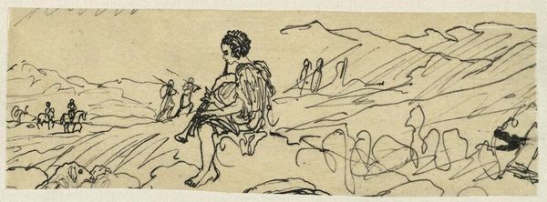 Orest Kiprensky sketched 'Anacreon’s Grave' with ink on paper. The drawing presents a scene of figures gathered in what appears to be a classical landscape, the sketchy lines creating a sense of immediacy. Kiprensky uses line to define form and space. Notice how the figures and foliage are rendered with varying degrees of detail, creating depth and texture. The composition is carefully balanced with a cluster of figures to the left contrasted by the singular, more detailed satyr to the right. The light source isn't explicitly defined, yet the varying line weights suggest a play of light and shadow, giving the figures volume and presence. This structured arrangement invites us to consider the interplay of form and content. How does the artist use the visual elements to evoke a sense of mourning or reflection? The drawing’s structured yet fluid lines capture a moment that is both classical and deeply human.