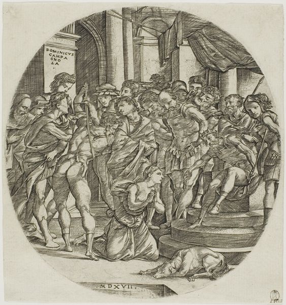 Editor: We’re looking at “Paulus door een adder in de hand gebeten” or “Paul bitten by a viper” by Hendrick Goltzius, made between 1580 and 1584. It's an engraving. I’m struck by the chaos and detail in this small print; it’s almost overwhelming. What do you see in this piece? Curator: The chaos you perceive is, I think, central to the scene. Think about the symbols here. We see Paul, unscathed by the viper’s bite, while the crowd looks on in astonishment. Consider the viper itself - often a symbol of treachery or hidden evil, especially in early Christian iconography. Its failure to harm Paul reinforces the concept of divine protection, doesn’t it? Editor: Absolutely. So the viper represents a challenge, or even evil, that Paul overcomes because of his faith. Is there more to unpack? Curator: I think about how fire also figures prominently; both literally and figuratively. A community is keeping warm around the bonfire and that can relate to themes of faith, resilience, and the triumph over adversity. What kind of cultural continuity do you suppose the artist has in mind? Editor: I suppose it suggests that faith provides warmth and sustenance during hardship, a shared human experience regardless of the specific narrative. Curator: Exactly! These intertwined symbols – the viper, the fire, and Paul’s immunity – work together. They reflect the potent cultural and religious narratives prevalent at the time. What would you conclude? Editor: It’s amazing to consider how an image from the late 16th century can continue to resonate emotionally and culturally today. It also reinforces the lasting importance of storytelling and symbolism to reveal the complex meanings found in this artwork.