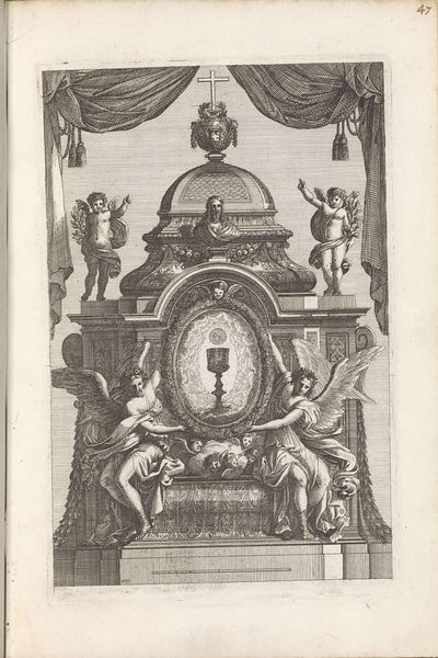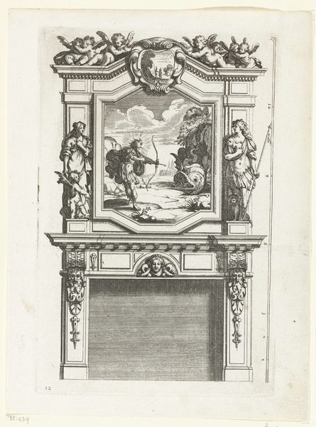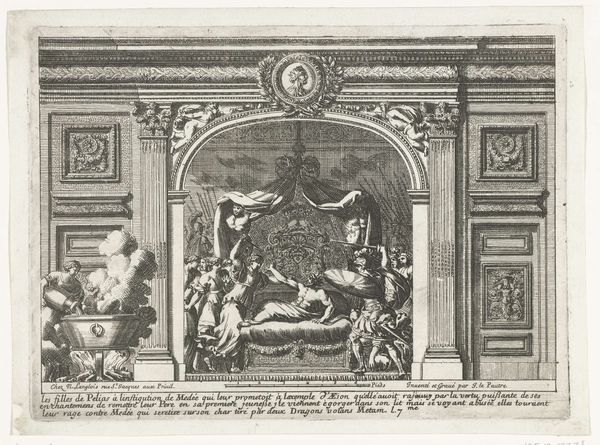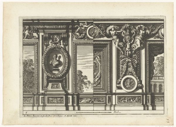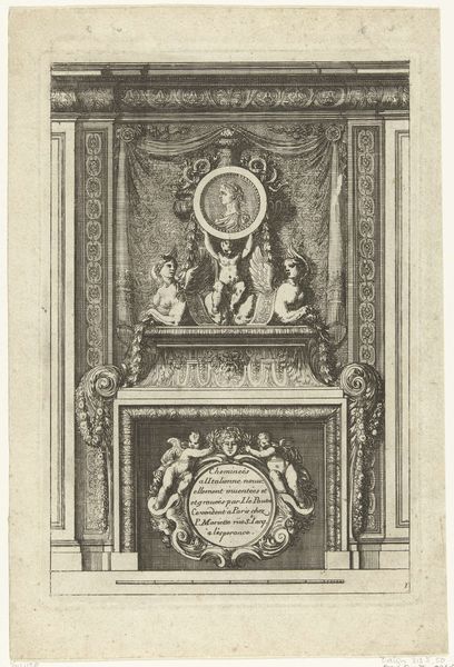 Jean Lepautre created this print, ‘Titelblad: Alcoues a l'Italiene,’ without a specified date, employing etching to render an elaborate interior scene. The composition draws the eye with its symmetrical arrangement of columns, statues, and decorative elements. The stark contrast between light and shadow, achieved through fine, precise lines, creates depth and texture, evoking a sense of classical grandeur. This print plays with architectural space, presenting a stage-like setting where the interplay of figures and ornate details hints at a deeper symbolic narrative. The symmetry and balance suggest an underlying structural order, yet the profusion of ornamental motifs destabilizes any sense of pure, rational design. Notice how the frame around the central inscription is not merely decorative but functions as a semiotic device, framing and directing our interpretation of the scene. The artist challenges fixed meanings through dynamic composition.