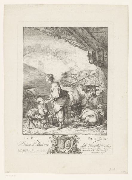 This etching, "Herderin op ezel bij een herberg," presents us with an intricate pastoral scene by an anonymous artist. The composition centers on a woman riding a donkey, set against the backdrop of a rustic inn. Note the artist’s use of line—delicate and precise—to define forms and textures. The hatching and cross-hatching create a sense of depth and volume, giving the figures and animals a tangible presence. The use of light and shadow enhances this effect, drawing our eye to the central figures while also highlighting the textures of the stone walls and foliage. The arrangement of elements is also noteworthy. The artist has carefully balanced the composition, with the figures clustered around the inn creating a sense of intimacy and enclosure, a subtle interplay between civilization and the natural world. Ultimately, this etching invites us to consider the formal elements at play and how they work together to create meaning.