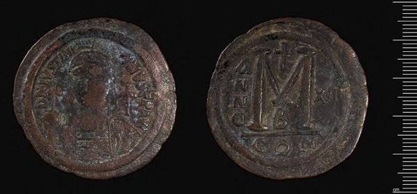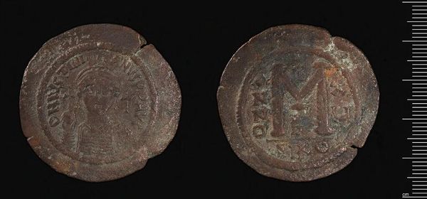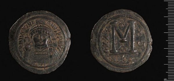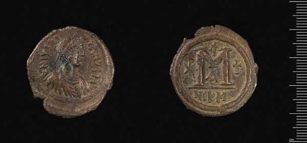 Editor: Here we have a bronze coin depicting Justinian I. It feels heavy with history. What’s particularly interesting about how this coin might have been viewed at the time? Curator: Consider that coinage was a powerful propaganda tool. The ruler's image, circulated widely, conveyed authority. How might the average Byzantine citizen have interpreted the image of Justinian on this coin? Editor: As an endorsement, a blessing, or even a sort of divine claim? Curator: Precisely. Coins like this helped to solidify Justinian’s image and policies in the public consciousness. Editor: It's interesting to think about something so small having such a large impact on public perception and imperial power. Curator: Indeed. A small object, with a weighty message.