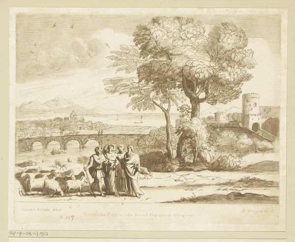 Richard Earlom created “Kustgezicht met ruïne en Apollo met de Sibille van Cumae” using an etching technique. At first glance, the sepia tones evoke a classical world, a tranquil scene where ruins meet the sea. Notice how the composition is structured by the strong verticals of the decaying architecture on the left, balanced by the softer, organic lines of the trees on the right. Earlom plays with depth, layering the foreground figures with the distant cityscape, creating a journey for the eye. The use of line is particularly striking; it's not just about depicting form but about creating texture and atmosphere, almost like a stage set. What’s fascinating here is how Earlom uses ruins as a form of semiotic language. The crumbling structures aren't just remnants of the past, they become signs that suggest the transience of power. It challenges our understanding of time and memory, reflecting the 18th-century obsession with classical antiquity but through a lens of decay. The artwork destabilizes any fixed notion of historical grandeur, inviting us to contemplate the passage of time and its impact on cultural symbols.