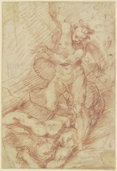 This drawing, Kneeling Man Bound to a Tree, rendered in sanguine chalk by an anonymous artist, presents a striking study of the male form enmeshed in constraint. The composition is immediately dominated by the figure, whose muscular torso and limbs are meticulously outlined against the textured backdrop of the tree and the surrounding landscape. Note how the artist uses line and shadow to convey the tension in the man's body, bound tightly to the tree. The upward thrust of his arms, contrasted with the kneeling posture, creates a dynamic interplay of forces. The choice of sanguine chalk, with its warm, earthy tones, infuses the scene with a visceral quality, heightening the emotional impact. This piece may reflect broader philosophical concerns, particularly the exploration of human limits and the interplay between freedom and restriction, rendered through masterful control of form and material.