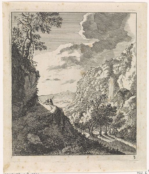 Johannes de Bosch made this landscape with figures under a rocky arch using pen and ink, probably sometime in the mid-18th century. It depicts an idealized classical scene, a popular theme at the time. The rocky arch, waterfall, and classical figures evoke a sense of the picturesque, a developing aesthetic ideal in the 1700s. It was a time when the grand tour was becoming increasingly popular, particularly among the British aristocracy. Young men were encouraged to travel around Europe, especially Italy, to learn about classical culture and architecture. These kinds of images feed into that culture, creating a romantic vision of classical antiquity. You see, the picture emphasizes the grandeur of nature, but also the presence of historical ruins. The figures add a human element, suggesting a connection between the viewer and the past. To understand this work better, scholars might look at travel literature from the period, architectural treatises, and collections of landscape prints. This helps us see the historical conditions which gave meaning to this kind of art.