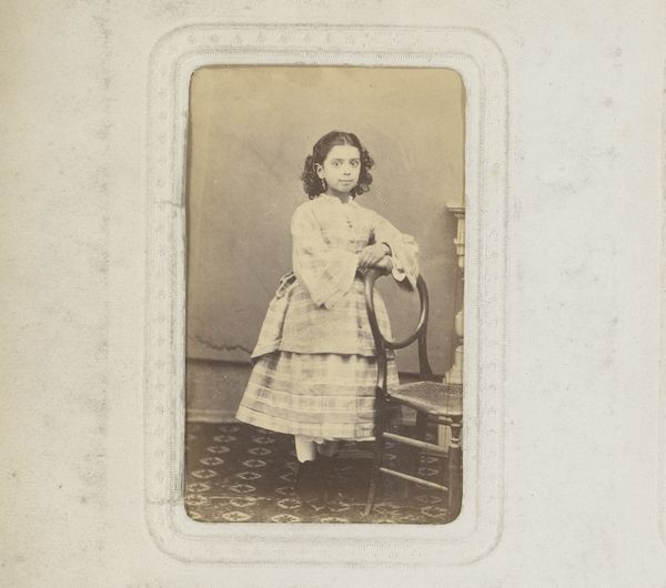 Curator: Here we have an intriguing photographic portrait dating from between 1860 and 1890, entitled "Portret van een meisje, staand bij een balustrade"—Portrait of a Girl Standing by a Balustrade. Editor: My immediate impression is one of formality, but also slight melancholy. The girl's pose is stiff, and the sepia tones add to a sense of faded grandeur. It makes me wonder about her story. Curator: Note how the composition centers the girl almost symmetrically. The verticality of the balustrade and curtain in the background firmly anchors her figure within the frame, emphasizing stability and perhaps constraint. Editor: Looking closer, I wonder what this portrait was meant to achieve? Who commissioned it? Was it simply a record of her likeness or an attempt to elevate her status within the societal framework of that era? The dress, so elaborate, almost overwhelms her. Curator: Indeed. Consider also the distribution of light. The subject is illuminated softly, but it accentuates the intricate details of her attire—the plaid dress, the lace trimming—emphasizing texture and depth, yet it also reveals the starkness in her facial expression. The light, however subdued, calls attention to the material details. Editor: I find myself drawn to the background details: the patterned carpet and simple curtain give clues about the setting but without fully revealing it. What social conventions dictated such a carefully staged presentation? The balustrade seems symbolic, a physical manifestation of barriers perhaps? Curator: The lack of clear narrative elements further underscores its semiotic richness. The young girl gazes outwards at the viewer and inwards perhaps. The texture of the backdrop, the light playing on the fabric, all work together to produce a study in muted visual texture and subtle tones. Editor: For me, seeing this work today is a reminder of photography's role in shaping historical narratives. It makes me question the power dynamics inherent in image-making and challenges me to look beyond the surface to understand the story that might have been intentionally hidden, or perhaps unwittingly revealed. Curator: I'm left reflecting on the sheer craftsmanship inherent in such early photographic techniques. Each element—composition, tone, texture—harmonizes to evoke a moment frozen in time, with a kind of emotional echo resounding into our own present.