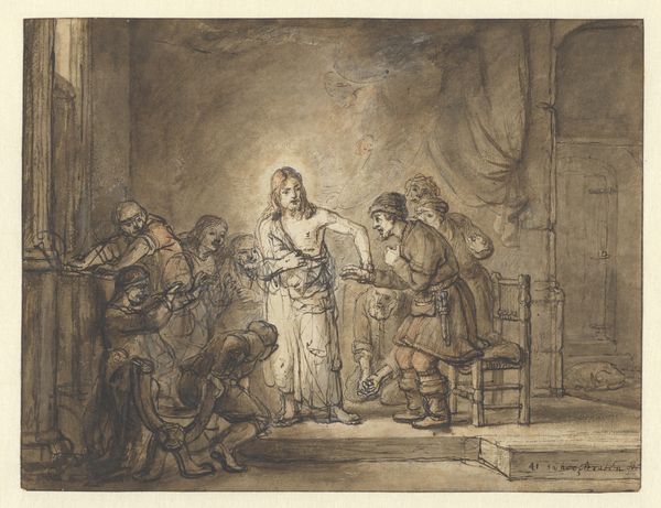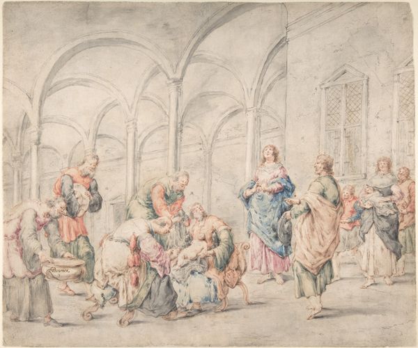 Curator: Jean-Baptiste Greuze created this work around 1761, titling it *The Marriage Contract*. It's rendered in delicate pencil and watercolor washes. Editor: My first impression is the intimacy of it. Despite the crowd, it feels so…enclosed, domestic. The limited palette, mostly browns and grays, contributes to this somber mood, doesn't it? Curator: Absolutely. The subject matter itself is weighty. A marriage contract signifies not just love, but social and economic alliances. Notice how the light falls upon the older figures, seemingly bestowing authority. Greuze uses this lighting to underscore the seriousness of the event. Editor: I am more interested in the physicality of the image itself. I see layers of drawing and color working almost like stages in a workshop. It has the appearance of something unfinished. What kind of labor do we suppose that involved? What status did such images command? I wonder who his clients were, too. Curator: Genre painting became highly popular. Greuze's naturalism and focus on domestic life certainly resonated. This is where his use of symbolism really comes to life, creating layered and meaningful narratives. Think of the contrast in the attitudes. While one person is eager about it, several seem reluctant to join it, and several others support it! Editor: The means of creating such an image meant a slow form of reproduction; even in this “quick” medium, the circulation of its motifs must have involved entirely distinct methods, compared to how similar images would now circulate across media. Did it democratize them at all? Curator: The symbolism used would not have been very inclusive in that way. But it opened new grounds in representing sentiment, that could affect many different types of patrons. I suppose it did, if we take it from that point of view! Editor: It’s all just so fascinating, thinking about how these scenes get materialized and re-materialized as time moves on, and how different viewers relate to them materially and aesthetically! Curator: For me, it's fascinating how Greuze could use such simple materials to express a timeless story about power dynamics, expectations, and the complexities within a family.