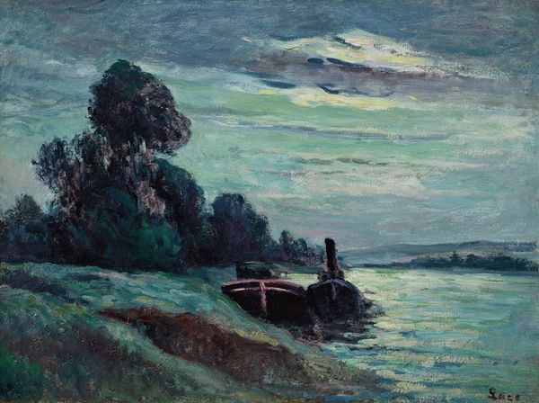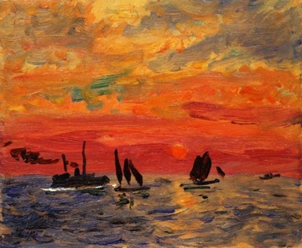 Here we see ‘Sailboats,’ an oil on canvas by Pierre-Auguste Renoir. The painting presents a dynamic composition dominated by blues and earth tones, with visible brushstrokes creating a sense of movement and light. Renoir’s focus here isn't on perfect representation but on capturing the sensory experience of the scene. Semiotically, the sailboats become signs that go beyond their literal meaning; they symbolize fleeting moments and the changing nature of perception. The horizon line, disrupted by soft, blurred landmasses, questions traditional landscape painting, reflecting a modern interest in destabilizing fixed perspectives. The texture of the paint itself—thick in some areas, thin in others—adds another layer, drawing attention to the materiality of the artwork. Ultimately, it’s the tension between form and dissolution that makes this painting compelling, inviting us to reconsider how we see and interpret the world around us.