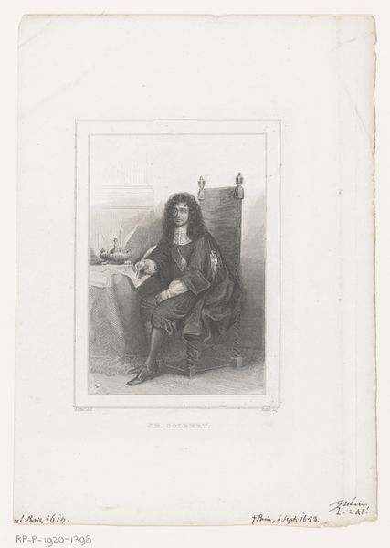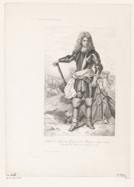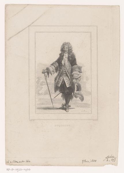 Editor: This is a portrait of René Duguay-Trouin, made sometime between 1835 and 1837 by Victor Florence Pollet. It's an engraving on paper. He looks… powerful, self-assured. Almost theatrical, standing in front of those ships. What do you see in this piece? Curator: Indeed, the theatricality strikes me as well. Think about the deliberate construction of this image. We have Duguay-Trouin, the celebrated corsair, framed by the very ships that signify his power. The ships act as almost halo. What do ships symbolize to you? Editor: Well, adventure, exploration… but here, definitely power, almost aggression. Curator: Precisely. The symbols create layers. The sword isn't just a weapon; it's a symbol of authority, of military prowess but think of the burden of constant military engagements! And look at the almost-affected pose, that hat… isn’t it almost a question of what this projects versus the man he actually was? What memories is this meant to conjure, and for whom? Editor: So, it's not just about what’s shown, but why it’s shown that way? The image seems to shape our understanding of this historical figure. Curator: Exactly! Visual symbols are never neutral. This print served a purpose, reinforcing a certain narrative about national heroes, and the price to pay for becoming such legends. Editor: I see it differently now! Thanks for pointing out the hidden stories embedded in the image. Curator: My pleasure. Every image carries a story. We just need to learn how to listen.