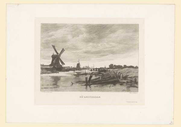 Curator: Welcome! We’re here looking at "Singel met bomen en molens langs het water," an etching on paper by Jan Hillebrand Wijsmuller, likely created sometime between 1865 and 1925. Editor: Immediately, I'm drawn to the atmospheric stillness. The monochrome palette evokes a strong sense of place, and of quiet labor along this waterway. It feels somber yet very beautiful. Curator: Absolutely. The etching captures a slice of Dutch life, where windmills aren't just picturesque but fundamentally tied to the region's economic and social fabric. Consider how these structures controlled waterways and powered industry. Editor: The textures are really speaking to me; you can almost feel the coarseness of the aged wood of those windmills and the subtle ripple of the water. Given the emphasis on printmaking, how does this challenge more traditional forms of ‘high’ art making in that time? Curator: In prioritizing etching, the artist elevates the print form to a place of regard. I can’t help but wonder, in observing this particular selection of windmills, does it represent the artist’s relationship to industry, and thus, potentially the working class? Editor: I like that! It’s about acknowledging labor, moving beyond simply romanticizing rural landscapes to examining what goes into shaping and sustaining those very lands. And I can’t help but consider—in the age of industrialization creeping through the Netherlands, these old windmills also would’ve carried different weights. Curator: Precisely, those contrasts invite reflections on a changing social landscape. Also think of how the artist situated the waterway in a central, almost dominant visual role. As an intersectional narrative of place, can it serve to represent social access for various people in Dutch society? Editor: So well observed. Now I’m wondering about the intended audience of such works at the time. Where these artworks were headed for more ‘private’ or commercial venues of dissemination or display? Curator: Exactly—examining that circulation unveils further layers of the work’s socio-political presence. Thinking about the work now, it feels less like a simple image and more a historical marker, and a marker of working practices in Dutch society. Editor: I concur, that's a fitting way to interpret it. And by looking at the artist’s materials and his methods, we better comprehend that the way these images are shared is not just aesthetic but imbued with socio-political dimensions as well.