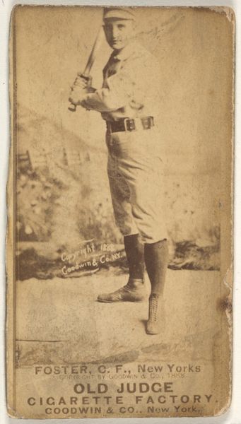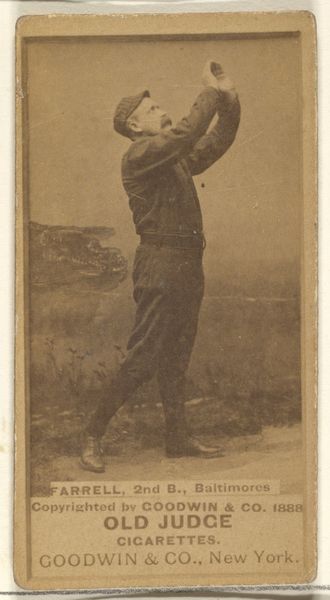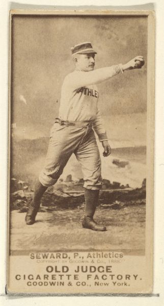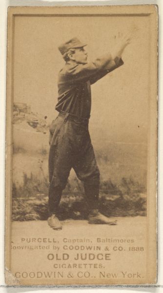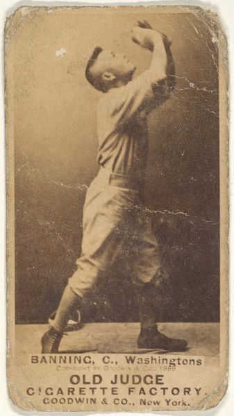 Curator: So, here we have a piece titled "John T. McGlone, 3rd Base, Cleveland, from the Old Judge series (N172) for Old Judge Cigarettes." It’s attributed to Goodwin & Company from 1887. What’s your initial reaction? Editor: Sepia dreams of Americana! There's something almost ghostly about the image quality, yet the baseball player's pose feels so alive, caught mid-throw, ready to launch into action. You can almost smell the ballpark peanuts and hear the crack of the bat, or maybe that’s just me. Curator: Not just you. This photograph—or rather, the print made from it—is a fascinating intersection of sport, industry, and popular culture. It's from a series of baseball cards included in packs of Old Judge Cigarettes. Consider how this trivial item used photography, lithography, and commerce to connect with the public and valorize sports. Editor: So, it was essentially an early form of advertising! I imagine kids trading these back then, dreaming of hitting home runs, unaware that years later, art snobs would obsess over the cards. It does raise some compelling ideas around labor, consumption, and value. It is literally advertising—a base form—and that makes it okay to cut through a few of our modern conceptions about the preciousness of art, perhaps. Curator: Precisely! The seemingly simple image involved the labor of photographers, printers, and factory workers, all contributing to the production of these ephemeral objects. Note too how tobacco companies promoted an ideal masculinity using idealized depictions of baseball players, connecting to contemporary cultural trends. Editor: Yes, and seeing it now, as an image, separated from its original context, it transforms. It's more than just a baseball card; it's a time capsule containing echoes of 19th-century values, anxieties, and ambitions. And, it kind of reminds me of how our modern sport-stars continue to hock garbage, hawking a lifestyle to which we might not actually have access. We might have, in this image, a premonition. Curator: Right, and beyond the content, there's also the process: photography was developing alongside industrialization. Cards like these democratized the medium; they’re portable images for the masses. What are we really willing to accept for some bubblegum? What about Cigarettes? How has media’s relationship with public health changed, and where do the threads still connect? Editor: The image is just so present with absence—faded but unforgettable, both antique and eternal. McGlone and his card both exist—and don’t. In one breath. It sort of transcends the sport itself. Curator: A thought-provoking piece with layers upon layers of historical context! Thanks! Editor: Likewise, until next time.