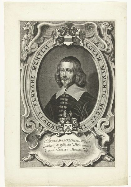 Curator: The artwork we're observing is a portrait of Henry II d'Orléans, Duke of Longueville, crafted in 1649 by Johannes Valdor. The style evokes that familiar gravitas of official portraiture during the mid-17th century. Editor: Right, right. The immediate feeling is, well, constrained. There's so much...stuff. Floral garlands, heavy drapes suggested in the etching, and the Duke himself feels a little lost within it all, doesn't he? Like a prize meticulously wrapped and tied with ribbons. Curator: The ornate details around the subject echo the status of nobility; the cascading flora could symbolize abundance and divine blessing, standard symbolic gestures intended to validate the sitter's importance and genealogy. Editor: Yes, it's all carefully arranged messaging. His armour hints at military strength. But that melancholic gaze... he seems to be looking beyond the fanfare, perhaps questioning it, or weary of it? I get the sense there's a complexity beneath the surface here, doesn’t quite square with all the bravado. Curator: That duality is common. Consider that public images often served very precise propaganda roles. The sombre tone you pick up on might reflect genuine character but could also represent humility – a virtue frequently feigned to appear pious in the eyes of the court. Or, it could subtly convey intelligence; that the Duke sees and understands the world as perilous and weighty. Editor: Clever observation. Looking closer, I'm also intrigued by the border itself; the geometric hatching gives an almost vibrating energy, a subtle tension surrounding the static figure. The overall craftsmanship seems quite amazing. How do you see this piece fitting into broader movements of the era? Curator: Valdor's skills were highly prized and were influenced by emerging notions about the monarch as the centre of power, of order and sophistication against inherent instability. These portraits played a role in cementing authority. He worked in that sweet spot. Editor: Well, seeing past the frills, it makes me appreciate this fellow, caught in his moment. Thank you. Curator: An intriguing journey, indeed, highlighting both calculated image and perhaps something more sincere buried within.