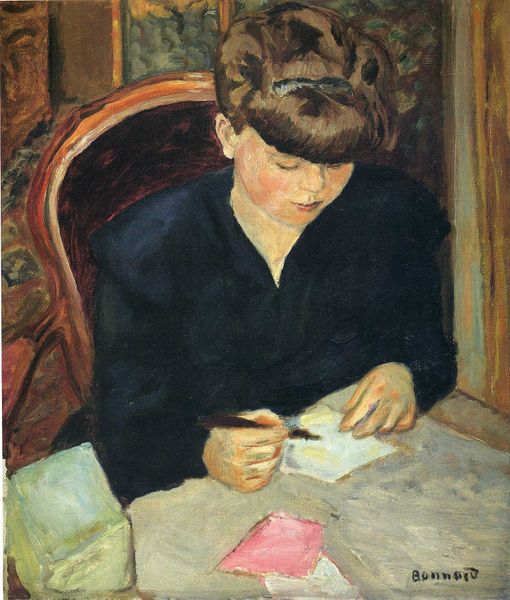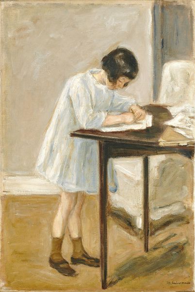 Editor: Stefan Dimitrescu’s "Margareta Drawing (Girl of the Author)" from 1927 is quite captivating. It feels so intimate, like we're intruding on a private moment. Oil paint on canvas gives a certain depth and warmth. How do you interpret this piece, especially considering its social context? Curator: The intimacy you feel is carefully constructed. Consider Dimitrescu’s position within the Romanian art scene of the 1920s. There was a growing movement toward national specificity in art, seeking to define a Romanian identity. Do you notice anything in the painting that might reflect that push for cultural definition? Editor: I suppose the patterned background feels somewhat folkloric. Is that intentional, to create a specific sense of place? Curator: Exactly! The background hints at traditional Romanian textiles or ceramics. Dimitrescu isn't just painting a portrait; he's embedding his subject within a specific cultural framework. He is not just capturing her likeness; what is he trying to express about the relationship of individuals to culture? Also, reflect on who gets represented, and how. What choices did Dimitrescu make regarding the representation of women? Editor: That's a very interesting perspective. It shifts the painting from a simple domestic scene to something with wider social commentary. It also highlights the role of the artist in actively shaping a cultural narrative, which seems relevant even today. Curator: Precisely. And looking at art this way reminds us that even seemingly private moments are always intertwined with larger socio-political forces. Editor: I agree. It’s fascinating to consider how Dimitrescu used something as intimate as a portrait of his daughter to explore themes of national identity. Curator: Indeed. Analyzing art from a historical lens deepens our appreciation and helps us recognize art's public and political role.