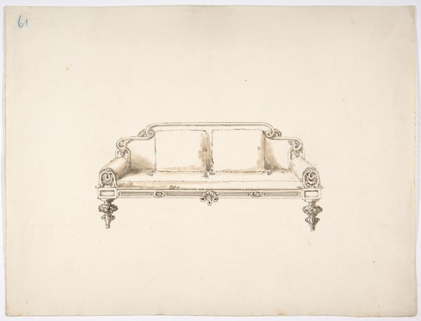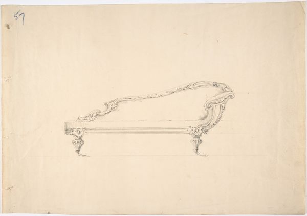 Curator: What strikes me first about this design is the airiness, the incredible lightness of the structure. It’s barely there. Editor: Well, it’s an etching of a design; perhaps the materiality is less crucial. We are looking at an artwork titled "Design for a Settee," attributed to an anonymous artist, dating back to the period between 1765 and 1795. It is currently housed at the Metropolitan Museum of Art. Curator: Note the geometric shapes playing against the organic curves of the floral carvings. What might seem purely decorative reveals itself as a precise, architectonic articulation of space. Editor: Its creation coincides with the rise of Neoclassicism, a conscious revival of Greco-Roman aesthetics amid shifts in social structures and power. Etchings such as these served as blueprints, disseminating aspirational design to an expanding market, standardizing taste… Curator: You use the word “aspirational”, and it is exactly right, with a double-meaning. On the one hand, to aspire to ownership; on the other, the settee "aspires," if one can imagine such a thing, toward lightness and air. This tension between grounded functionality and aspiration gives it so much power. The structure almost disappears to the eye. Editor: Considering that furniture, particularly among the aristocracy, was potent with socio-political connotations. Imagine the elite lounging – signifying leisure and inherited wealth, broadcasting specific ideological tenets about order, taste, and domesticity in the age of revolution. Curator: Agreed. It's not merely an object but a symbol. Consider the perfect lines, a subtle commentary on social structures and control. What the designer is trying to say through his organization of line and geometric volumes. Editor: Indeed. Analyzing these artifacts reminds us of the intrinsic link between art, society, and the silent power of everyday objects. Curator: Absolutely. Seeing how even a design sketch operates on multiple layers gives a richer understanding, beyond mere decoration. Editor: Ultimately, the work embodies the aspirations and ideologies of a changing era, revealed through line, form, and socio-cultural narrative.