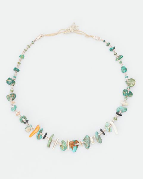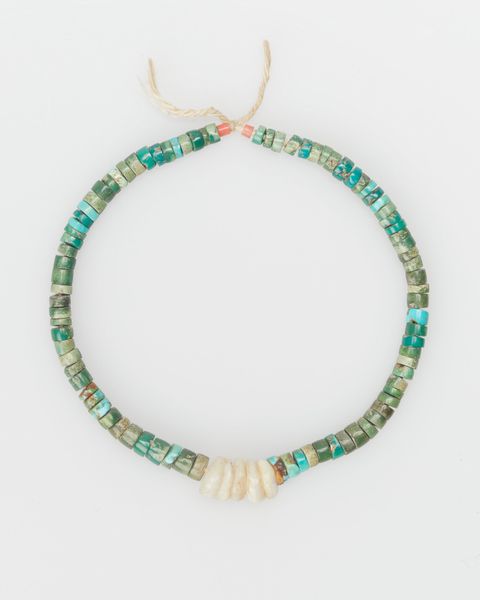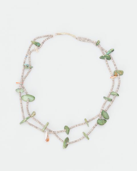 Editor: So, here we have an intriguing mixed-media piece titled "Necklace" from around the 20th century, housed at the Minneapolis Institute of Art. It feels so organic and tactile to me. I'm really drawn to the textural contrast between the smooth, almost water-worn, turquoise and what appear to be shells. What strikes you most about the formal qualities of this work? Curator: Indeed. The arrangement of elements creates a compelling visual rhythm. Consider the seriality inherent in the arrangement of what seems to be small shell discs, juxtaposed against the varied sizes and placement of the turquoise stones. Does the density of these stones, clustered toward the lower register, suggest anything about the piece’s compositional logic? Editor: It almost anchors the piece, gives it a weighted feel at the bottom despite its airy construction. It definitely draws my eye downwards first. The way the stones interrupt the horizontal lines of the shell beads too, there's this subtle tension between the linear and the more amorphous forms. Curator: Precisely. It’s in this visual counterpoint, this dialogue between regularity and irregularity, that we find much of its aesthetic interest. And note the tonal variations within the turquoise itself; a play of greens and blues that subtly modulates the visual field. Editor: I hadn’t focused so much on those tonal shifts before, seeing the turquoise more as a block of colour. Examining the piece from that structural perspective really brings out nuances I would have missed. Curator: By focusing on the interplay of line, texture, and form, we begin to unravel the visual strategies employed, seeing the aesthetic intent embedded within. The absence of a known author further pushes one to only look to the object, a key element of formalism. Editor: That really sheds a new light on how to approach jewelry as a form of art; thank you for sharing your expert insight! Curator: It was a delight to engage with this piece through formal analysis.