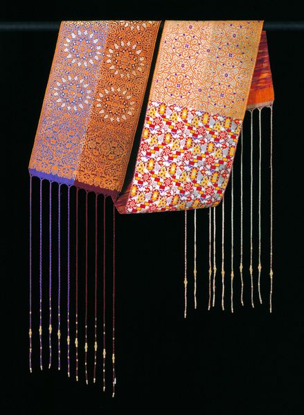 This belt, of unknown origin, presents a fascinating study in texture and chromatic relationships. Measuring over 2 meters in length, the brocade belt is divided into distinct fields of color and pattern, setting up a visual rhythm that is at once decorative and deeply structural. The silver and gold hues create a subtle shimmer, which, combined with the geometric patterns, may evoke a sense of opulence. The regular repetition of circular motifs across the fabric establishes a formal order, a kind of visual grammar, in which the slightest variation becomes significant. Notice how the hanging threads, shift in color from silvery white to a reddish brown. The belt challenges our assumptions about ornamentation and function. Is it merely a decorative element or does it serve a larger cultural or symbolic purpose? As you move closer, consider how the piece operates as a system of signs, reflecting and perhaps subverting established notions of beauty and status through a series of formal contrasts and aesthetic choices.