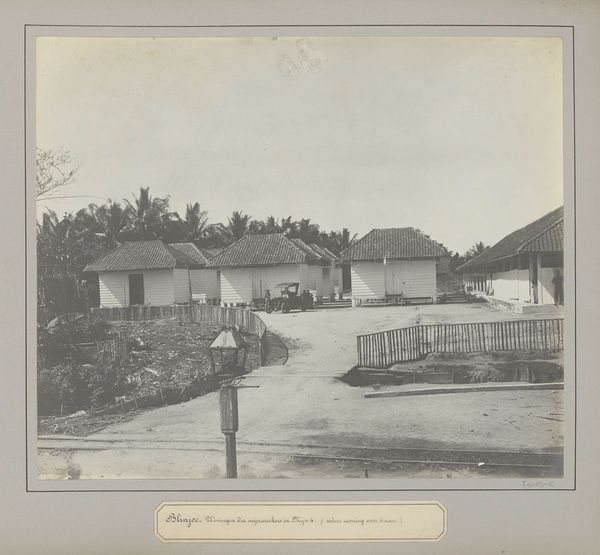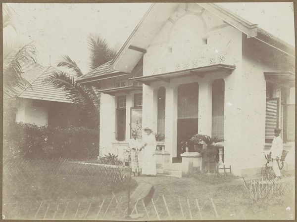 Curator: Here we have "Two Men in Front of a House," a remarkable albumen print dating back to 1886, crafted by the talented Kassian Céphas. The photographic image offers a view into, likely, a domestic setting. Editor: Oh, my! It feels like stepping into a dream – a sepia-toned, slightly faded dream. The light, almost trembling, lends an incredible softness to the entire scene. There's such quiet in this image, it's palpable. Curator: Indeed. The composition emphasizes a rigid structure. The house stands as a primary geometric form, against the, softer more organic surrounding vegetation, the trees. And the two figures are rigidly composed within this constructed plane. Editor: You know, those figures, they almost look like ghosts, planted carefully, precisely in their spots. Is it just me, or do they seem... isolated? Like, physically together, but miles apart emotionally? Curator: The albumen process itself contributes significantly to the image’s tone and texture, imbuing a depth that captures light in interesting ways.. One can observe that the landscape has a formal quality due to the sharp resolution afforded by this process. This allows for incredible detail. Editor: True! Every leaf on those trees seems to have its own little story to whisper. It feels less like a record of reality and more like an evocation of memory – hazy, precious, and just a little bit melancholic. What do you think they were talking about, those two men? What kind of life did they live here, framed in time? It sparks the strangest sense of yearning, as if I'm glimpsing someone else's past and longing to somehow know more. Curator: It does serve as a historical artifact. It opens to us discussions of representation, technology and power. This artistic artifact speaks volumes about its moment. I hope visitors will continue to be enlightened by its complexities. Editor: What a marvel. It almost encourages time-traveling through imagination, to see if we can unravel any little piece of the great mystery.