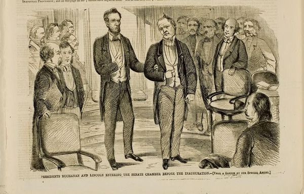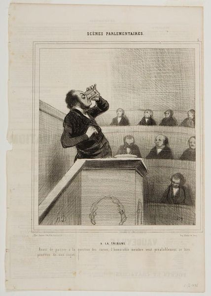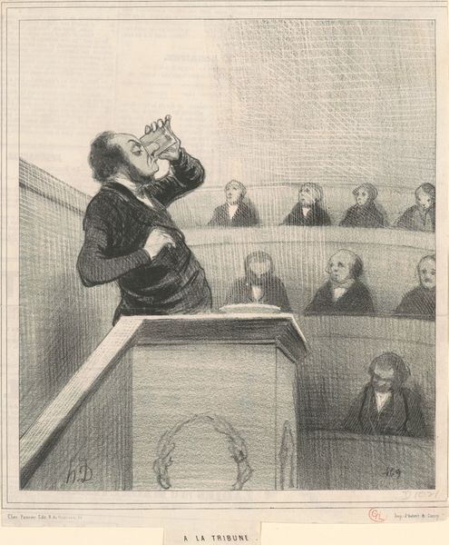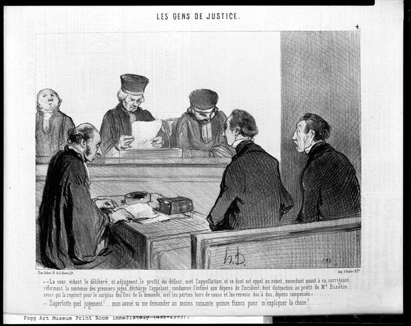 Editor: This print, "Jurors Listening to Counsel, Supreme Court, New City Hall, New York," by an anonymous artist, depicts a courtroom scene. The somber mood and the attentive gazes of the jurors really strike me. What symbols do you see at play here? Curator: The hats! Notice the many top hats left on the bench. In the 19th century, hats symbolized social status and respectability. Their removal here signifies the solemnity of the judicial process, a temporary shedding of worldly concerns for impartial judgment. How does that influence your perception? Editor: It adds another layer of seriousness to the scene. Knowing this, I see the drawing as a historical document about civic duty. Thank you for pointing out those details.