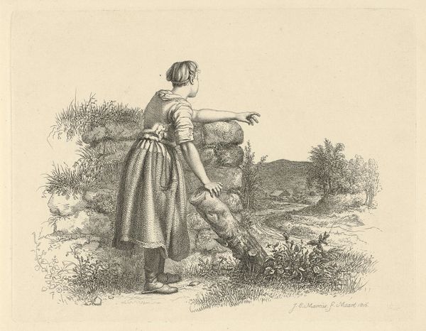 Jacob Ernst Marcus created this print, "Two Boys at a Gate," in December 1810 using etching. It offers us a peek into the world of childhood and the realities of class during the early 19th century. The image features two young boys in a natural setting. One boy sits barefoot on the ground, appearing relaxed, while the other stands by a weathered fence, his back turned to us. The details in their clothing, or lack thereof, suggest a life of poverty. During this period, class distinctions were stark, and childhood experiences varied greatly depending on one's social standing. Marcus, who was of Jewish descent, navigated a society marked by both opportunities and limitations for minorities. His work often touches on themes of everyday life, reflecting the experiences of ordinary people. How might their gender and class shape their opportunities? What futures are available to them? This etching captures a quiet moment, but it speaks volumes about the complex social fabric of its time.