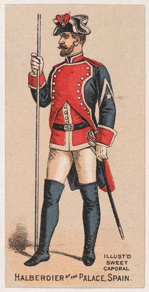 Editor: Here we have "Full Dress, Halberdier, Spain, 1886," a print from 1888 by Kinney Tobacco Company, meant as a promotional item. I find it fascinating that a tobacco company created such detailed illustrations. What's your take on it? Curator: It's important to remember that mass production changed art’s role. Before photography became widespread, printed illustrations, like this one created for Sweet Caporal Cigarettes, circulated images widely. So, what kind of cultural work do you think this object is performing? Editor: It’s advertising a luxury product. The detailed uniform hints at wealth, tradition, and perhaps even imperial power, selling a certain lifestyle with the cigarettes. Curator: Exactly. Consider the means of production. The chromolithography, enabling inexpensive color prints, democratized imagery but was also used to reinforce social hierarchies. The artist, likely anonymous, becomes a cog in a commercial machine. Does the military figure lose or gain agency being deployed to serve the demands of commerce? Editor: I see your point. We are analyzing not only the figure represented but the labor and materials that brought this commercial image into being, connecting “high art” techniques like detailed illustration to everyday consumption. The material reality of production influences the image's meaning. Curator: Precisely. And notice the text, an advertisement masquerading as illustration. It invites a different consideration of artistic labor and how boundaries of art get policed to serve commerce. Editor: Thinking about it, this tiny image encapsulates so much: military attire, tobacco advertising, mass production. I never thought about the labor behind these promotional prints. Curator: Hopefully now you’ll be more curious. It's vital to always remember art materials within broader cultural forces.