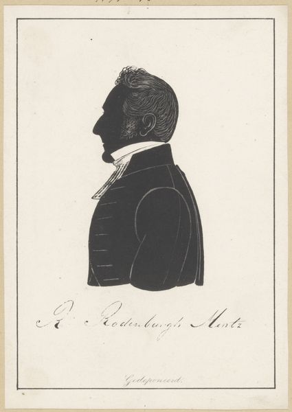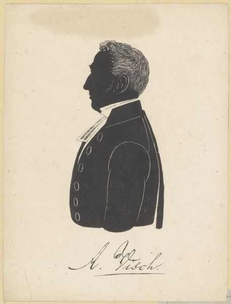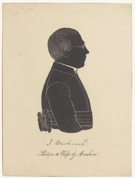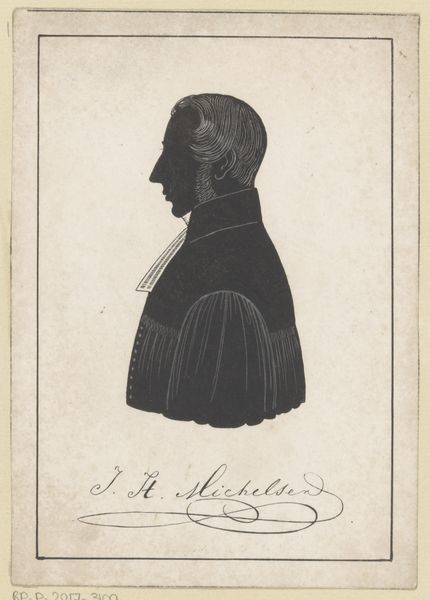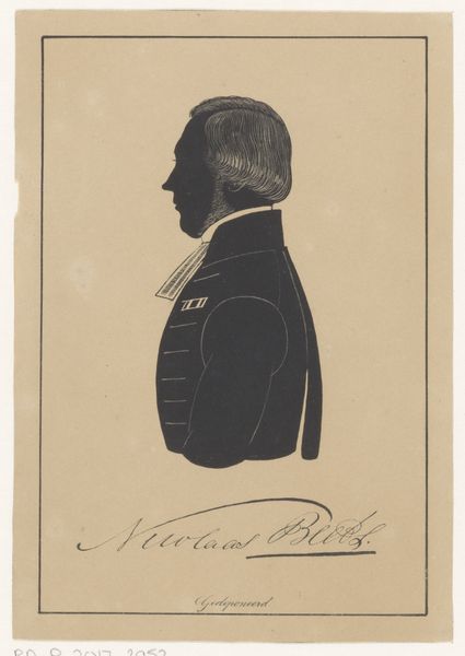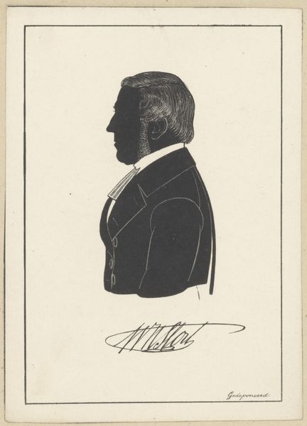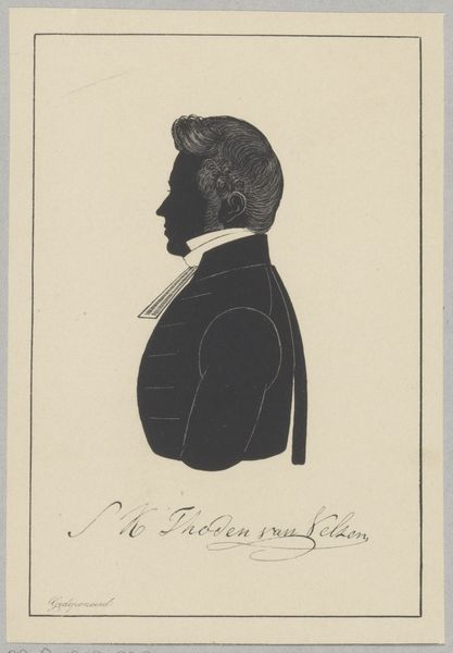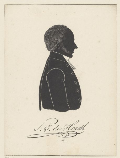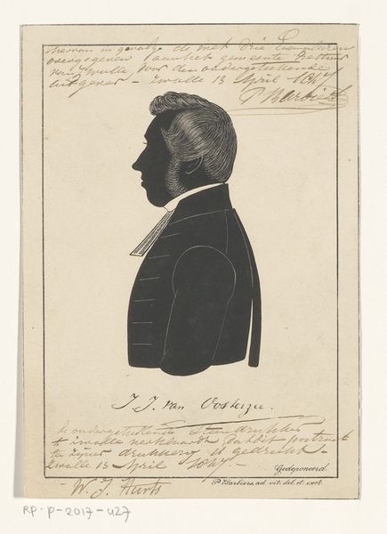 Pieter Barbiers IV rendered this silhouette portrait of Jacob Carel van de Velde using paper and scissors. The composition is strikingly simple: a stark black profile set against a pale background, demanding our attention through its stark contrast and elegant economy of form. The profile, a classical form of portraiture, reduces the individual to an outline, a play of light and shadow that speaks to the essence of form. The silhouette is not merely a representation but an interpretation, reducing complex features to basic shapes. Note the precision of the cut, particularly in rendering the hair, which suggests texture and volume despite the medium's limitations. The stark contrast of the black silhouette against the light background creates a visual tension, a dialogue between presence and absence. This is not just a portrait, but an essay on form, perception, and the reduction of reality to its most essential elements.