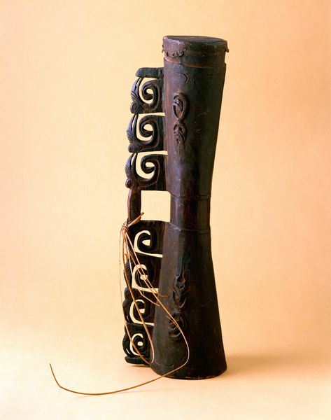 Editor: Here we have a ceramic vase made by Hamada Shoji, sometime in the 1960s. I’m really drawn to its simple, almost primitive design. That looping reddish shape on the dark surface – what do you make of it? Curator: The rough-hewn form speaks volumes, doesn't it? Think about calligraphy, where a single brushstroke can encapsulate an entire feeling. That looping shape could be a stylized character, or perhaps a personal emblem – a kind of visual signature or sigil loaded with meaning. It activates the dark glaze like a memory surfacing from the depths of time. Editor: A memory? That’s interesting. So, it’s not just decoration then? Curator: Rarely is anything *just* decoration! Consider how motifs repeat across cultures, evolving over centuries, carrying emotional and cultural resonance. Does that spiral evoke any particular feeling for you? Does it suggest movement, containment, or something else entirely? Editor: I see what you mean... It's got this sense of swirling energy. It’s grounded at the bottom, then unfurls, reaching outwards, but somehow, the loop pulls the energy back in. Curator: Exactly! The grounding balances the upward surge, hinting at both expansion and the cyclical nature of existence. How might our understanding shift if that loop were broken, or pointed downward instead? Editor: That would make it feel really different - maybe more aggressive or sad? I guess it shows how much thought went into that one, seemingly simple design. Curator: Indeed. Symbols are never static. The power of an image resides in its ability to evolve, reflecting our ever-changing relationship to the world and ourselves. Looking at the vase this way shows how its images encapsulate more complex stories, too. Editor: That’s such a different perspective from what I was thinking! Thanks!