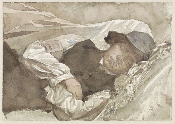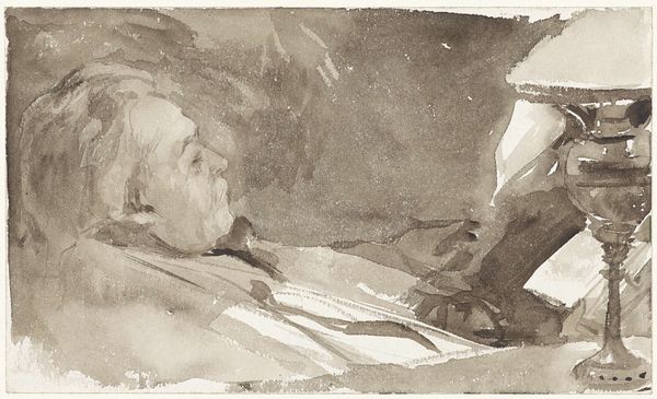 Curator: Here we see John Singer Sargent's "Man Reading", a watercolor piece. It's striking how casually intimate the scene feels. Editor: Indeed, there's a distinct atmosphere of repose. The composition, with its fluid washes and deliberate blurring of lines, immediately conveys a sense of peaceful contemplation. Curator: Notice the subtle interplay between light and shadow, particularly how the lamp seems to echo the man's own enlightenment through reading. The lamp as a symbol of knowledge is an age-old trope, isn't it? Editor: Precisely. The soft illumination casts the figure in a dreamy, almost ethereal light. But the composition itself is superb. The man's reclining posture creates an engaging diagonal axis. Curator: And the way Sargent uses color, the muted blues and browns, reinforces this feeling of quiet reflection. Editor: A masterful study in form and symbolism, inviting us into a world of intellectual solitude. Curator: A fitting subject for Sargent, adept at capturing the nuances of human experience. Editor: A wonderful, thoughtful piece.