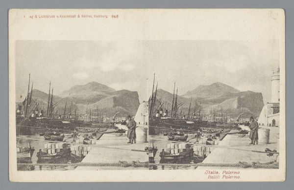 Curator: This photograph, titled "Gezicht op La Cala en de Monte Pellegrino aan de kust van Palermo," captures a view of La Cala and Monte Pellegrino on the coast of Palermo. It's attributed to Giuseppe Incorpora and believed to have been created sometime between 1856 and 1914. Editor: Wow, that title is a mouthful! But seriously, it has this incredibly dreamy, hazy quality about it, almost like a faded memory. There's something peaceful, yet slightly melancholic, in the sepia tones and the way the details seem to gently dissolve into the background. Curator: The use of sepia is characteristic of photography from that period, which lends itself perfectly to a discussion about the rise of pictorialism. Incorpora presents a vision that is in alignment with notions of aesthetic refinement and even evokes certain visual analogies between photography and painting. Editor: Pictorialism, okay, but there’s also just a sense of daily life happening. You can almost smell the sea air, hear the creaking of the boats, the activity near the pier… And look at Monte Pellegrino lurking back there! Curator: Absolutely. The photograph allows us to explore the socio-economic fabric of the time. The presence of workers, boats, and goods alludes to the city’s role as a bustling port. These elements offer insights into the class dynamics within the city. The structures, in relation to the natural landscape, also speaks volumes about man’s dominion over nature. Editor: Dominance, perhaps… but nature still has that brooding presence in the background, a reminder of a force bigger than everything. It is faint, almost as if it is being blurred out of the frame as progress and industry take over. What does that suggest? I feel it suggests we be cognisant of human existence in conjunction with nature. Curator: That tension is central, really. This photograph gives insight into Palermo as a nexus of Mediterranean trade and life in the 19th and early 20th centuries. I love to contemplate these works from the viewpoint of today. Editor: Exactly! It is thought provoking to think about the artist behind the lens and imagine the lives and perspectives embedded within. Curator: Indeed, and hopefully such inquiries contribute to a deeper connection to both the photograph and Palermo's past. Editor: Definitely leaves you with a gentle nudge of introspection. Thanks Giuseppe Incorpora.