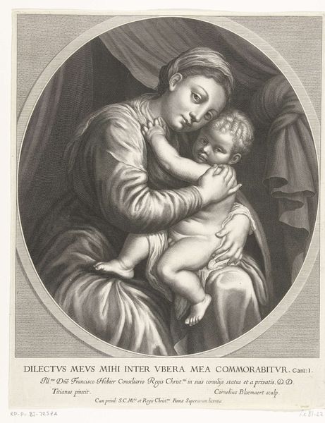 Curator: Let's discuss Jean Louis Roullet’s "Madonna and Child," a print held here at the Harvard Art Museums. Editor: The stark monochrome creates such a solemn mood; the figures seem almost sculpted from the paper itself. The strong chiaroscuro throws the viewer's gaze immediately onto her face. Curator: Indeed. Roullet, working in the late 17th century, captured the symbolic weight of motherhood and divinity through this timeless image. The book she holds, no doubt, is a signifier for the scriptures and her profound wisdom. Editor: That's quite interesting because the linear precision and the balanced composition really emphasize the formal qualities here, echoing Renaissance ideals in its depiction of an almost perfect form. Curator: Absolutely. The way the child clings to her also speaks to the enduring human need for protection and love, a visual echo that transcends time. Editor: Precisely, and seeing this print, even its inherent visual structure becomes a symbol in its own right, pointing back to those ideals. Curator: Seeing how these cultural symbols manifest through visual language really makes it so intriguing. Editor: I agree; this exercise in form unlocks a lot more than I expected.