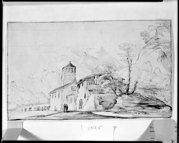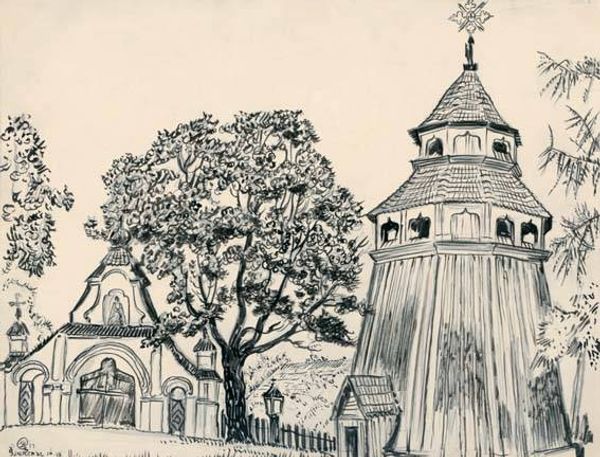 Editor: So, this is Barbara Westman's "Exterior of Busch-Reisinger Museum." It's a charming little drawing. What strikes me is how it feels both whimsical and a bit haunting, like a fairy tale gone slightly askew. What do you see in it? Curator: It reminds me of a stage set, doesn't it? The bare trees, the almost cartoonish stars...Westman seems to be inviting us into a dreamscape. The building itself, usually so grounded, feels strangely weightless here. Are we looking at reality, or a memory, perhaps? Editor: I hadn’t thought about it as a stage set, but now that you mention it, I totally see it. The lighting, the starkness. Curator: Exactly! And maybe that's the key, isn't it? To see the familiar anew, to find the magic, or the melancholy, in the everyday. It's certainly made me rethink my own perception of the building. Editor: Me too! I'll definitely look at the museum differently now.