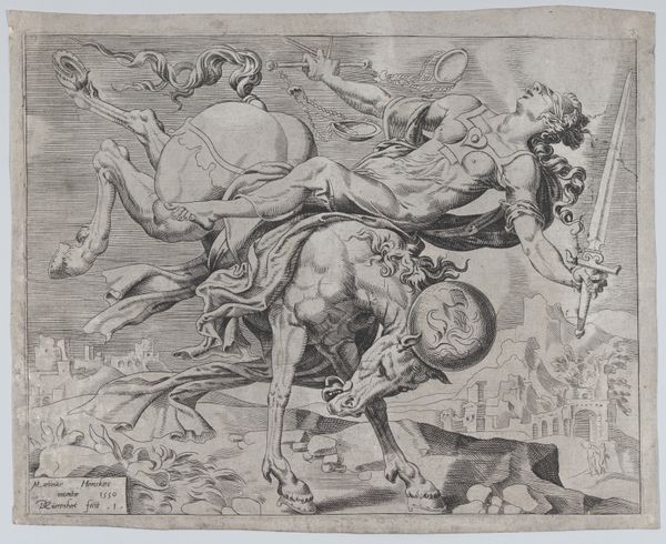 Curator: This print, residing here at the Rijksmuseum, is entitled *Een vrouw die haar man vertrapt,* which translates to *A woman trampling her husband.* Created sometime between 1610 and 1663, it’s the work of Cornelis van Kittensteyn, rendered using engraving techniques. Editor: It strikes me as quite chaotic! A rather imposing woman dominates the scene, and there's a frenetic energy to the composition. What immediately jumps out is her rather gleeful expression contrasted with the visible distress of those around her. Curator: That gleeful expression, I think, hints at the satirical nature of the piece. We see a figure, presumably the husband, literally flattened beneath her feet, his possessions scattered around him, a potent symbol of reversed roles and the perceived dangers of female dominance in that era. The overturned jug likely symbolizes the loss of household stability. Editor: Precisely! The jug speaks to broken roles within the marriage but notice too, the detail of what appears to be children reacting—one clinging to the woman, the other hiding. This all adds to the emotional layers, doesn’t it? The image certainly taps into deep-seated anxieties regarding social order. It is so interesting how period details like her cap or the shape of those jugs tie the emotional context to a historical world that felt those specific social fears in ways very foreign to us. Curator: And consider the print medium itself. These images would have been widely circulated, making this commentary accessible to a broad audience, solidifying the visual language surrounding gender roles and power dynamics. Editor: Right. The distribution amplifies the message. Was this typical for Kittensteyn to focus on social satires and marital themes like this? Curator: Yes, Kittensteyn was known for these genre scenes and caricatures. He cleverly used recognizable tropes, turning ordinary life into biting social commentary. Notice how he emphasizes caricature elements by using rather strong contrast and highly exaggerated features in order to drive home the satirical social commentary. Editor: It’s a complex dance then, isn't it? Using common cultural anxieties to provoke, perhaps even reinforce, specific ideas. It gives you a stark glimpse into that period's concerns. Curator: A fascinating window, indeed. It makes one consider how societal anxieties translate into visual representations that leave a lasting mark across centuries.