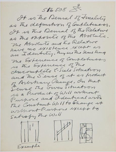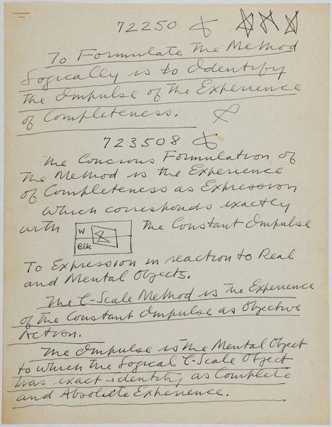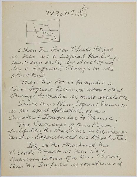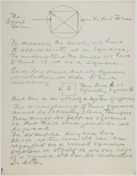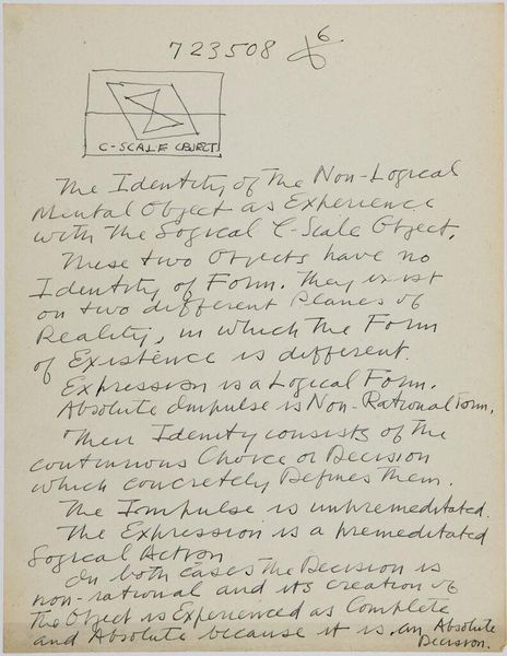 Curator: Here we have Stuart Davis's intriguing "Art Theory Text with C-Scale Object Diagram," its date, unfortunately, unknown. It’s ink on paper, 27.8 by 21.4 centimeters. The Harvard Art Museums hold this cryptic sheet. Editor: It feels like a secret code, doesn't it? A personal manifesto scrawled on a scrap. There's something almost obsessive about the density of the text and the diagram. Curator: Davis was obsessed! He sought a logical foundation for abstract art. The "C-Scale" seems to be a system he devised for organizing visual information—a quest for objectivity. I imagine the diagram as a key. Editor: It also feels like a cage, though. All that text about logic and the constant absolute impulse...isn’t that trying to contain something inherently uncontainable? Isn’t art about breaking free? Curator: Perhaps Davis saw freedom in structure. This page hints at a deeply personal effort to reconcile intuition and intellect, to find his unique way of seeing. Editor: I guess even revolution needs its rules sometimes. Seeing it in this light is...illuminating.