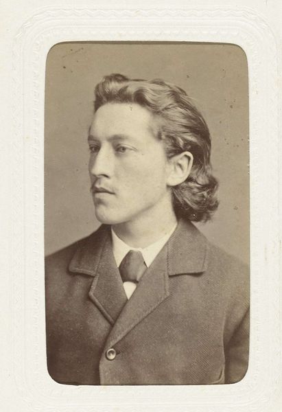 Curator: It’s interesting to see this "Studioportret van een jongeman met halflang haar," by Albert Greiner, a gelatin-silver print dating from somewhere between 1863 and 1866. A glimpse into a different time, wouldn't you say? Editor: A faded daydream of a fellow. There's such an intensity in his eyes. Is it pride? Or is it just a deep longing seeping through the sepia tones? Curator: Well, thinking about the materiality, the gelatin-silver printing process itself was relatively new then, offering a sharper image. What fascinates me is that someone like Greiner embraced it, transforming a commercial studio practice into a realm of artistry. He uses light almost like a painter. Editor: Agreed. Photography becoming less about stiff documentation, and more about the poetry of existence. What kind of labor went into each print at that time? Because these were made in multiples, right? Curator: Yes, that is correct. Consider that creating each print involved preparing glass plate negatives, sensitizing the paper, precise timing in the darkroom... then imagine the posing, sitting for long exposures, the chemistry of it all. Photography democratized image-making. Suddenly, capturing a likeness wasn't just for the elite, yet each image remained hand-crafted. Editor: And it changed painting, I think! Painting becomes more… subjective! Now, this picture's haunting. Do you see any influence from Romanticism? It does something to my pulse—his dreamy eyes… I want to paint him. Curator: Yes, definitely Romantic. Just look at the soft focus, that gentleness with which the light caresses his features. And then he, himself. All of the details surrounding the creation add to that sentiment: he seems to exude a pensive melancholy so characteristic of that era. A man yearning, perhaps, for something beyond the confines of his reality. It pulls at the heartstrings, doesn't it? Editor: The materials speak volumes here, too. That slight blurring around the edges, those chemical interactions creating such unique depth. You feel that this wasn't mass production; that is bespoke creation by someone thinking and feeling... Someone very close to the young man with dreamy eyes. Thanks for pointing it out! I see his humanity better, now. Curator: Indeed. These works whisper tales of time, materiality, and the art of photographic creation itself, revealing unique encounters between process, perception, and artistic expression. It gives us, also, a better sense of our shared histories.