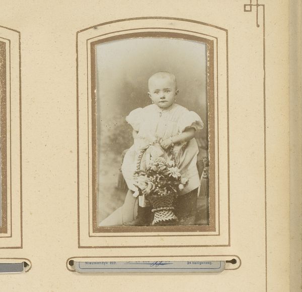 Curator: This is Abel Bordéria’s, *Portret van een zittend kind,* or *Portrait of a Seated Child*. It's an albumen print, placing it sometime around 1874 to 1879. Editor: My first impression is of a miniature monarch. Perched in that ornate armchair, the child's expression conveys a surprising amount of self-possession for such a young age. Curator: Photography in the late 19th century took on portraiture to cement bourgeois values and create a semblance of familial posterity. This is particularly evident in carte-de-visite or the family photo album, reflecting social status and stability. Editor: Yes, look at all the layers—the decorative carpet, the tasseled chair, and even the draped fabric in the background create a tableau of carefully curated symbolism. In many ways, the child isn't just an individual but represents a lineage and a promise of the family's future. The chair is clearly a symbolic stand-in for a throne. Curator: What’s intriguing is that, although photography became accessible during this period, sitting for a portrait remained a relatively formal and perhaps a stiff affair, further solidifying these ideals through popular representation. The genre-painting aspects can't be dismissed either—it represents a slice of life elevated to an art form. Editor: There's also a kind of fragility—albumen prints are so delicate, prone to fading. The photograph becomes not only a record of a person but also a memento mori, reminding us of time's passage. I am intrigued by the child’s bare feet—it adds to a touch of disarming candor, subtly challenging the formal atmosphere of the portrait. Curator: And the bare feet draw the viewer to question how truly authentic a slice of life Bordéria presents. Were those tiny feet purposefully exposed, or does it point toward more spontaneity than we allow for? These formal sittings served to control narrative but also present opportunity. Editor: Precisely! The juxtaposition of vulnerability and the posed formality highlights our yearning to freeze moments and imbue them with lasting meaning, despite the fact that these posed portraits may conceal more than they reveal about genuine intimacy. Curator: By analyzing its creation and function, we reveal the interplay between artistic aspiration, societal norms, and the emergence of photographic practice during a fascinating transitional time. Editor: And perhaps reveal the symbols that endure across the ages of familial projection.