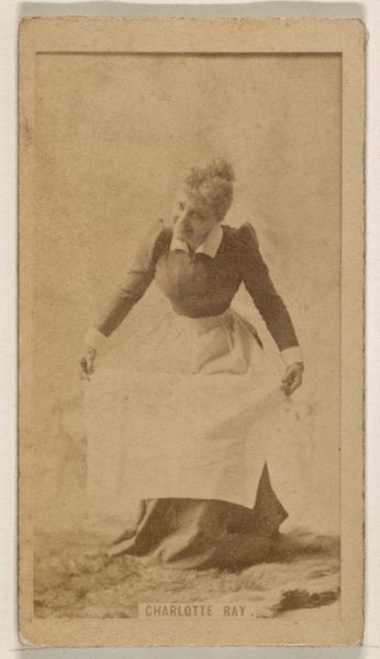 Curator: What immediately strikes me is the intimate scale, almost like a hidden treasure. Editor: Well, hidden might be right. We're looking at "Charlotte Ray," from the Actresses series issued around 1890 by the Kinney Brothers, as a promotional piece for Sweet Caporal Cigarettes. It's an albumen print, essentially a photograph reproduced as a print. Curator: The production seems pretty straightforward—commercial photography, designed for mass appeal and distribution. I'm curious, what sort of paper would they have used? The subtle discolouration would give insight into the methods, I think. Editor: Exactly! Consider how images of women, even professional women like actresses, were being circulated and consumed at the time. Tobacco companies were essentially objectifying women to sell their products. Curator: So, you're focusing on the industry's manipulative intention? I would suggest also appreciating the skills that were needed at that time for producing a print like this. There’s also an undeniable elegance in the process. The development of the image, layering and fixing of the photo is intriguing, and this has been lost for a while due to digitalisation. Editor: Absolutely. But the elegance is complicit in reinforcing a social hierarchy. The act of framing an actress for consumption ties into a legacy of gender inequality and exploitation that can be examined using critical lenses, for instance how this contributed towards establishing beauty standards that, even nowadays, we challenge. Curator: Hmm, that raises a good point. Still, one wonders what impact those standards have had. The very fact of making photography affordable and mass produced is indeed part of a larger discussion to do with class and access, so that more groups can see themelves represented and access ways of manufacturing a version of themselves in those kinds of commercial formats. Editor: Agreed. It highlights that something as "simple" as a cigarette card offers a complex interplay of art, commerce, gender, and cultural values. Curator: A blend, certainly! A delicate piece of material culture. Editor: Precisely. Hopefully these discussions have enabled a different view.
