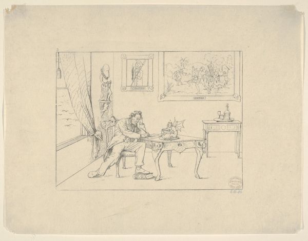 This etching, Two Men Drinking at a Table by a Fireplace, was created by Jozef van Snick, who lived through both World Wars and died in 1945. The image shows two men in working-class clothing enjoying a drink together indoors, perhaps in a tavern, with one man drinking from a bottle. The cultural and historical context here reflects a moment of respite and camaraderie amid challenging times. Consider the personal circumstances of these figures; their clothing suggests manual labor, their posture, exhaustion, and the drink, a temporary escape. Van Snick's work offers an intimate glimpse into the lives of ordinary people, capturing their moments of solidarity and solace. The emotional tone of the artwork speaks to the shared human experience of seeking comfort and connection in community. It's a narrative that acknowledges the weight of daily struggles but also the enduring bonds that sustain us.