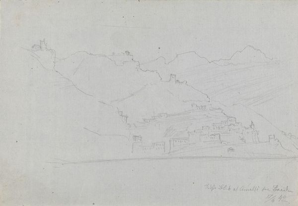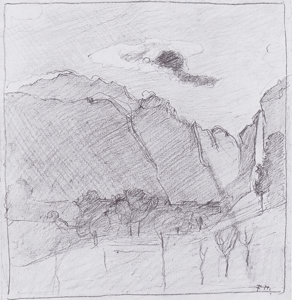 Curator: Ferdinand Hodler’s pencil drawing, “Lake Thun from the path to the plate Schynigen," created in 1906, offers a glimpse into the sublime beauty he found in the Swiss Alps. Editor: There's something remarkably ethereal about this drawing, like a half-remembered dream. The subtle pencil lines create a landscape that's both imposing and fleeting. Curator: Indeed. Hodler frequently returned to this motif in his work. The lake, nestled between those colossal mountain forms, it’s like a wellspring of the collective Swiss consciousness. The mountains represent endurance and a certain stoicism. Editor: The composition is intriguing; Hodler creates rhythm through the repetition of lines. Those diagonal lines creating layers, and how they all direct your eyes back and forth, and eventually further back. I'm thinking of structuralist ideas around binary oppositions - the sharp mountain edges versus the fluid, soft form of the clouds… Curator: Ah yes, those sweeping curves in the sky. The cyclical nature of weather patterns, representing the transient nature of existence itself – perhaps mirroring the ephemeral nature of life. We are invited to contemplate our place in this landscape. Editor: It's all about lines! The precision of those pencil marks shaping everything! A language that speaks of the underlying architecture of the landscape itself. Did Hodler adopt particular geometries, consciously perhaps? Curator: Very likely. Hodler was drawn to the idea of parallelism, reflecting universal harmony through nature’s inherent order. In this light, these lines might be an echo of the Swiss democratic values; individuals coexisting side by side. Editor: Looking at the whole, though, the tonality makes everything recede. Hodler invites the viewer to contemplate not just the composition but the very act of seeing itself. It reminds me a little of phenomenological reduction: how do we arrive at meaning through form alone? Curator: Fascinating. By reducing the landscape to its most basic elements, Hodler may indeed invite a contemplation beyond representation itself. Editor: For me, the drawing feels more like an exercise, perhaps laying the groundwork for a future painting. Curator: For me, it carries a timeless quality, resonating far beyond its initial rendering. Editor: Regardless, it's an intimate and captivating work.